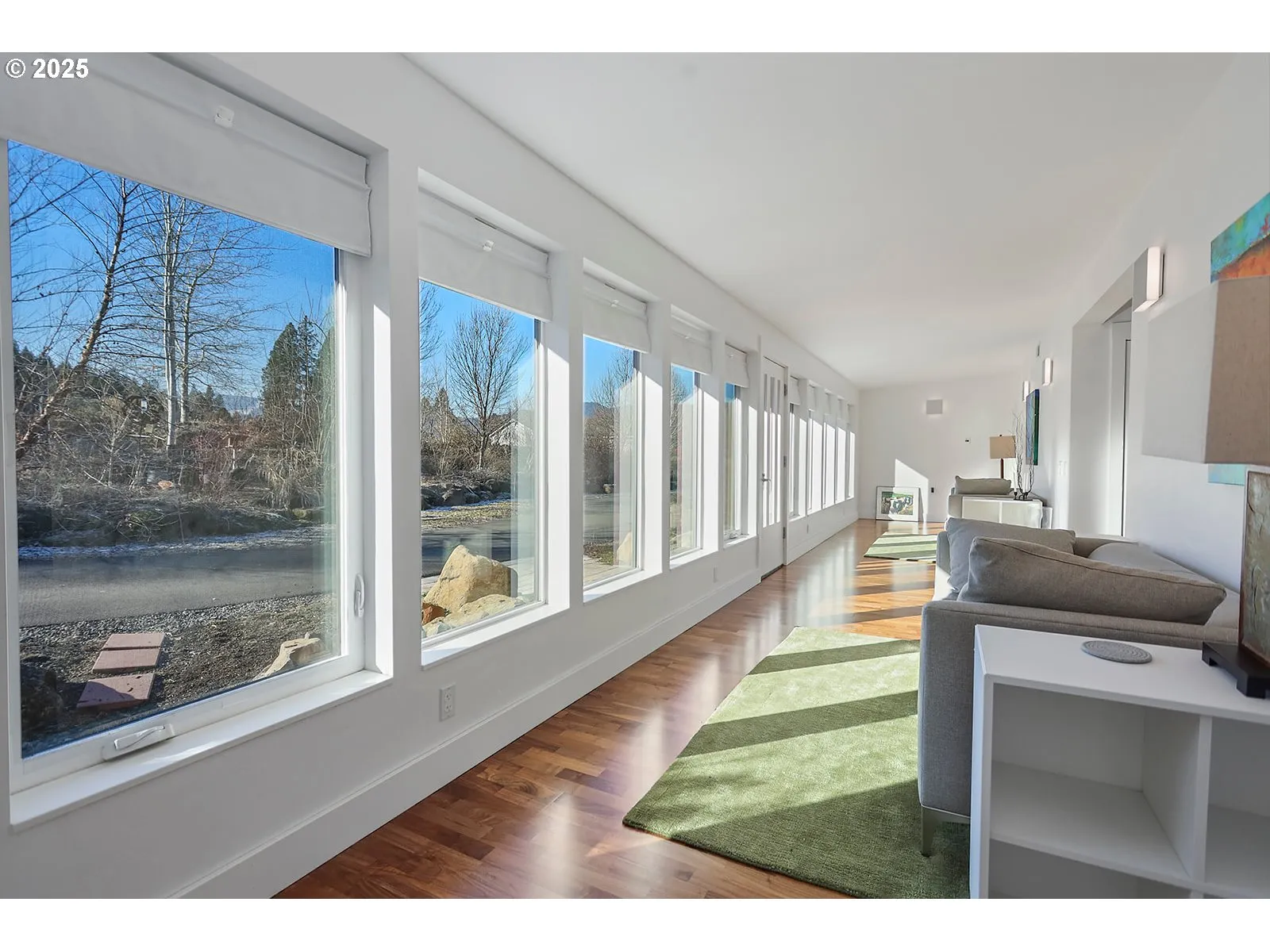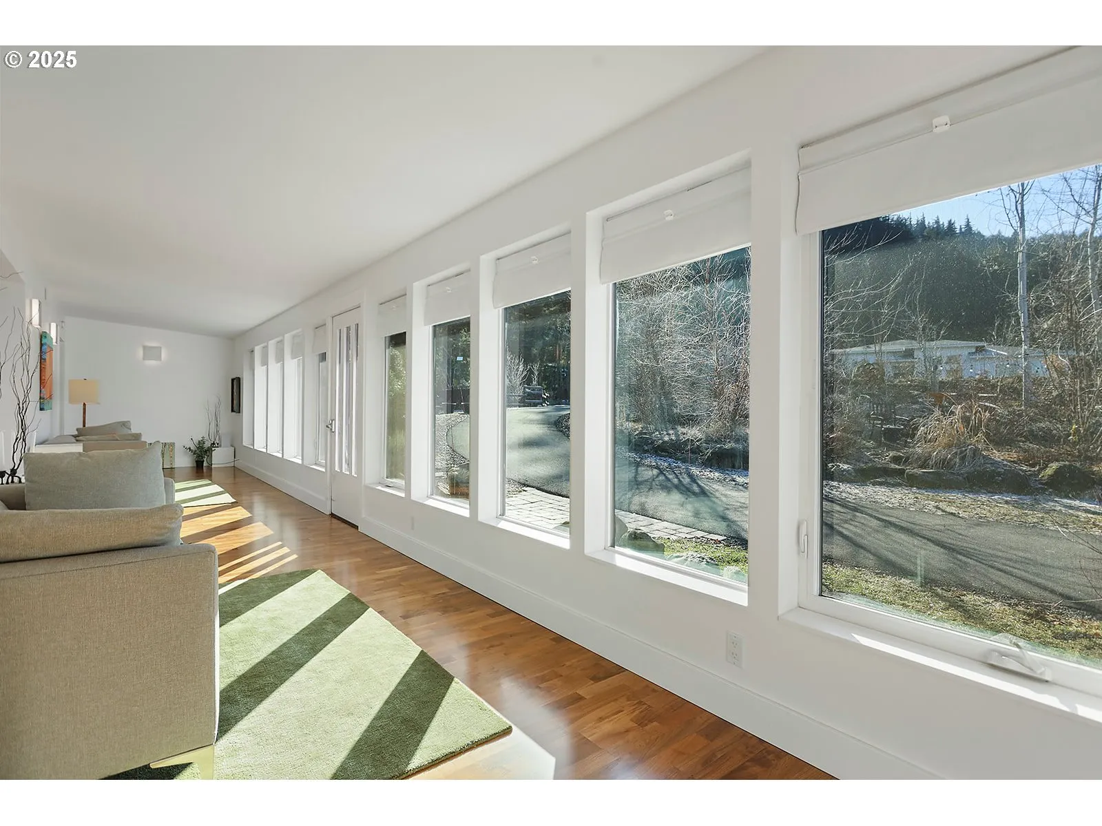This stunning modern home on 2.65 acres offers an exceptional blend of style, space, and functionality. With soaring ceilings and expansive windows, the three-bedroom, three-bathroom home is flooded with natural light. As you enter, a beautifully designed sunroom welcomes you, which is strategically placed to maximize natural light and create a warm, inviting atmosphere. The gourmet kitchen is a chef’s dream, featuring high-end appliances, plenty of workspace, and a walk-in pantry with a rolling ladder. New engineered walnut Kahrs hardwood flooring runs throughout with radiant floor heat. The primary bathroom offers a luxurious retreat with a heated towel bar for added comfort. Fresh interior paint enhances the home’s bright and modern feel. A spacious deck extends the living area outdoors, perfect for entertaining. The finished daylight basement includes a separate entrance, a full bathroom, and radiant floor heating—ideal for extra living space. Outside, a paved circular driveway leads to the detached, oversized four-car tandem garage, also featuring radiant floor heating, a workshop, a full bathroom, and is wired for an electric car charger—offering excellent potential for ADU conversion. Additional storage space is available beneath the garage. The beautifully landscaped property features an expansive garden with raised beds, creating a serene and functional outdoor oasis. A truly unique property with endless possibilities!