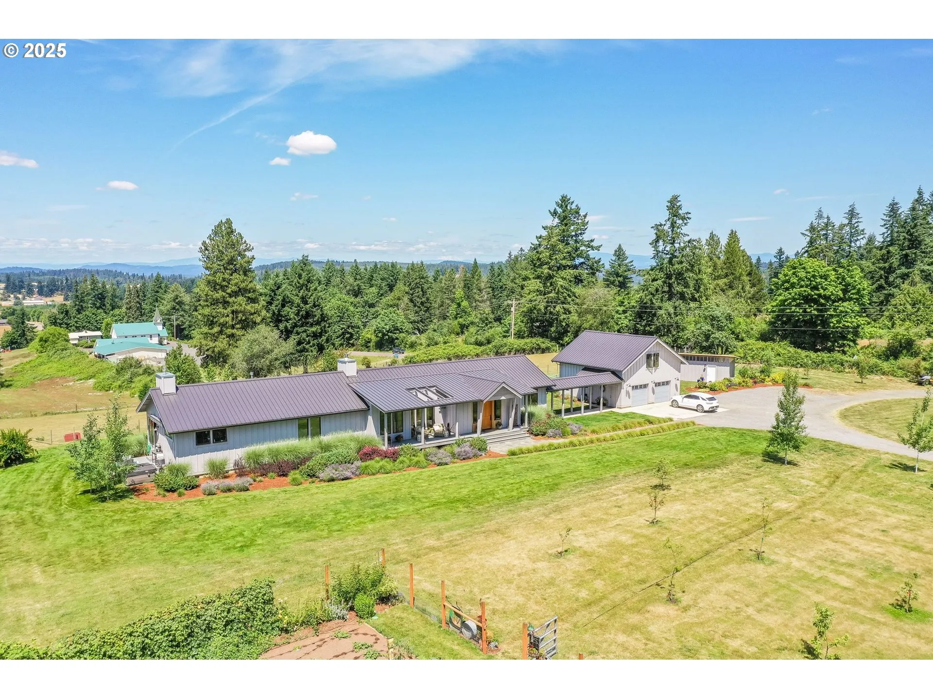Welcome to Sage Farm, a peaceful 6 acre retreat with panoramic views of downtown Portland and the surrounding territory. Custom-built in ’21 by architect owner with intention and care, this single-level home was designed for comfort, ease, and connection to its surroundings, inside & out. The exterior was thoughtfully designed for low maintenance, reducing costs and time spent on upkeep while preserving the home’s modern aesthetic. Inside the layout balances openness and privacy, with vaulted ceilings, warm natural light, and thoughtful touches. The kitchen is anchored by waterfall-edge quartz island, a picture-perfect view window, & walk in butler’s pantry. Marvin sliding doors open wide from both sides of the great room, inviting seamless indoor-outdoor living. The den offers a great flexible space. The primary suite includes private access to a spa and deck, a perfect place to unwind while taking in the landscape. A 2nd bedroom features its own ensuite bath, offering privacy and comfort for guests or extended stays. The home’s dual heat pumps provide zoned, energy-efficient comfort year-round. Outside, the stunning landscape was professionally designed by a landscape architect to complement the home’s architecture and natural beauty. From the breezeway (a nod to a cherished family home in the Northeast) to the privacy wall that doubles as an art feature, every inch of Sage Farm reflects the values of intentional living. The detached studio apartment above the garage includes a full bath and kitchenette, perfect for guests, creative use, or multi-generational flexibility. You’ll also find a 4000 sqft irrigated garden, a greenhouse, and space for a future barn or arena. Customize the grounds & suit your lifestyle: keep livestock, grow more, or enjoy the stillness. There’s much more to discover. Ask for the full list of curated features and finishes. Sage Farm is the kind of home that makes you want to stay a while and enjoy a life of peace and understated luxury.