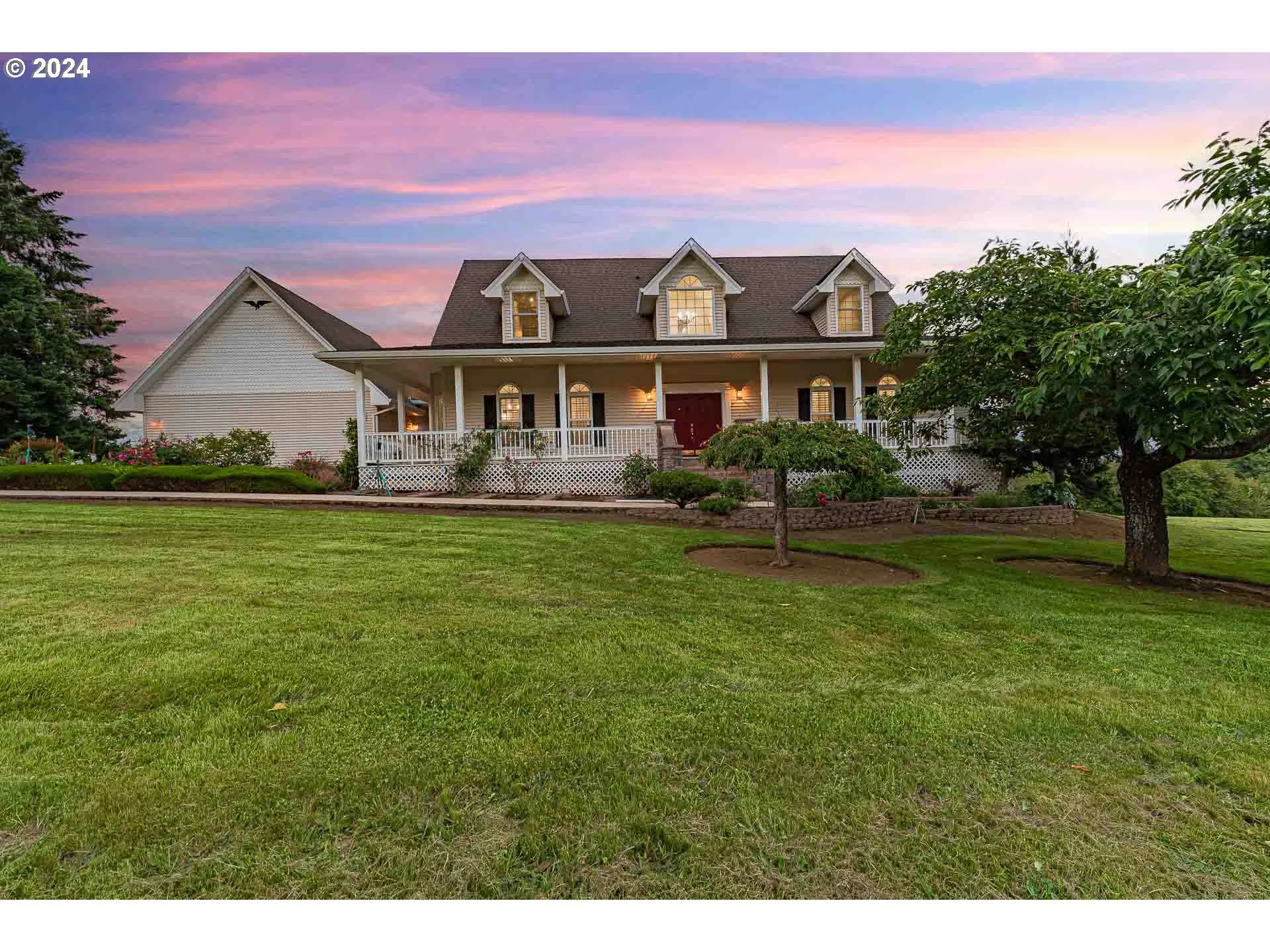 Step foot into your very own tranquil oasis. Welcome to O Maha Nui! Translated, this means Place of Great Joy. Behind your private gated entry, lies over 6 pristine acres surrounded by secluded forest. This property truly has it all and more. This beautifully built 4400sqft custom home with wraparound deck, overlooks the stunning and secluded property while still being only minutes from shopping & restaurants in downtown Portland. The gourmet kitchen features a newer Wolf gas range, pot filler above the stove, custom cabinets, large side-by-side refrigerator, and a beautiful island which overlooks the expansive great room with its vaulted ceilings and carefully crafted, custom gas fireplace. The large screened-in porch overlooking fields and woods is perfect for year round enjoyment. In the spacious primary bedroom, you will find a generously sized en-suite with clawfoot tub, large walk-in closet, and a private porch for you to soak in the views. The expansive lower level has all new updated flooring with potential for multi-gen living, theater room, or whatever bonus space you can dream up. On the lower level you will also find a cold storage pantry fantastic for stocking up, or could be converted into a wine cellar. New lighting, interior paint, and ample storage throughout the entire home. The immaculately landscaped park-like property contains many different fruit trees, gardens, pond, and so much more. This property also boasts an oversized 2 bay shop, fully livable cottage/ADU with its own private detached garage, 2 covered RV carports, a chicken coop, plus a huge barn with horse stables and a potting room. This property is perfect for animals, toys, and all of your hobbies. You need to see this one to believe it!