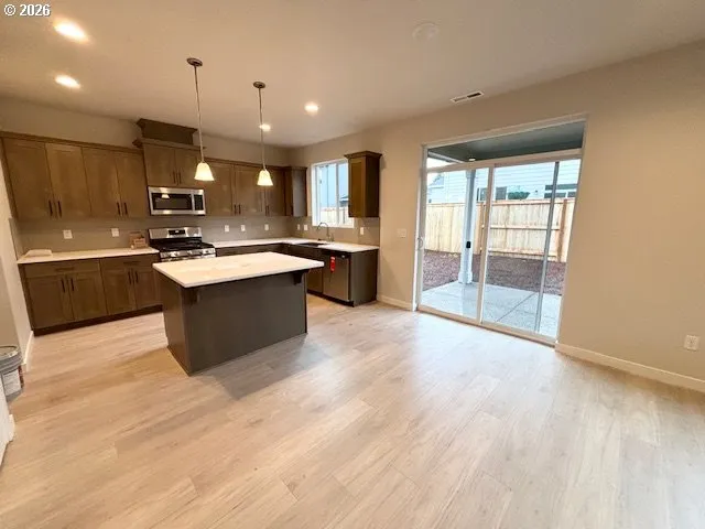 Move In Ready Home! Large RV parking space on side of garage. 4 bedrooms, 2.5 bathrooms plus a loft. Kitchen with Quartz countertops, gas stainless steel appliances. Great room concept with cozy gas fireplace. Walk out to covered patio and fully fenced back yard! Spa-like primary suite separate shower, soaking tub, dual sinks and walk-in closet. Tall Ceilings and Big Windows.