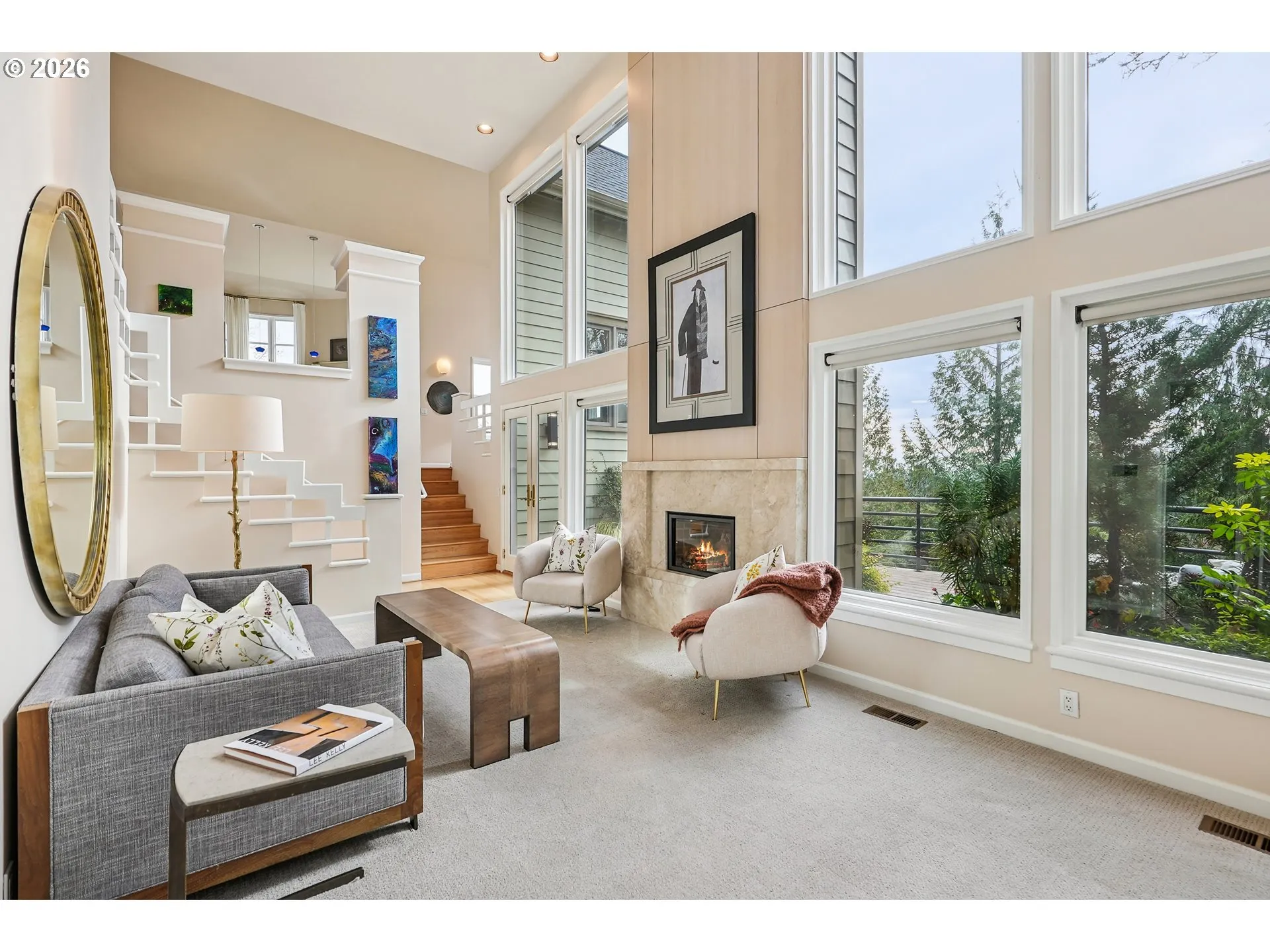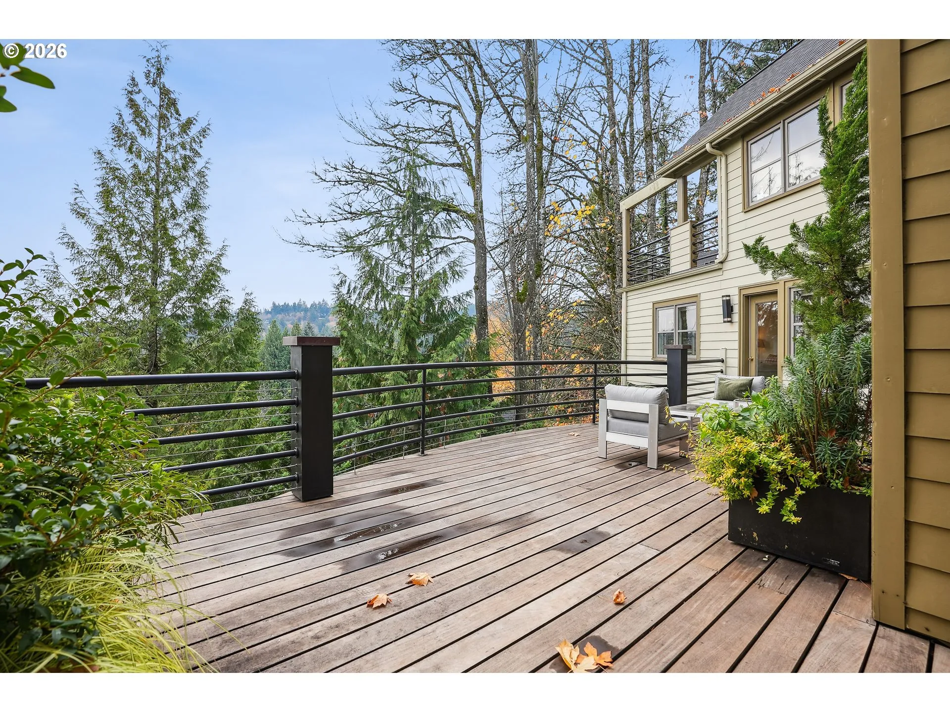 OPEN HOUSE, SAT, 2/21, 11-1 AND SUN, 2/22, 12-2PM! At the end of a dead-end street in the coveted Portland Heights neighborhood, a contemporary retreat awaits. Custom ironwork by artist Lee Kelly frames the entry, a sculptural invitation that hints at the thoughtful design within. Step through the door & you’re met w/soaring ceilings, gleaming hardwood floors, & unique architectural windows that pour light into every space. On the main level, the kitchen serves as the heart of the home. Outfitted w/Stone counters, stainless steel appliances from Jenn-Air and Wolf, & a comfortable eating area that seamlessly opens to the family room. A gas fireplace, custom built-ins, and French doors to the first of three view decks create a space perfect for both quiet mornings and lively gatherings. The formal dining room completes this level. Down a half level, the living room expands on the home’s sense of space & light. Floor-to-ceiling windows frame the treetops and views, while another gas fireplace adds warmth and ambiance. French doors lead to yet another deck for an ideal perch to take in the serene greenway below and spectacular views of Mt Hood. This level also hosts a welcoming guest bedroom, a full bath w/a marble vanity, a dedicated office, & the laundry room w/ample storage & counter space. Continue down to a versatile bonus level & an ideal second family room, fitness studio, creative workspace, or optional bedroom. Upstairs, the primary ensuite feels like a private sanctuary. Vaulted ceilings lend a sense of openness while the walk-in closet provides generous storage. The spa-inspired bath offers a marble double vanity and a two-headed shower system. There is access to a third deck, where sweeping views of the Oregon landscape create a breathtaking daily ritual. Low-maintenance, upgraded gardens create quiet beauty and showcase another Lee Kelly sculpture. This is a rare opportunity to live in a place where architecture, nature, and design come together in harmony. [Home Energy Score = 4. HES Report at https://rpt.greenbuildingregistry.com/hes/OR10187904]