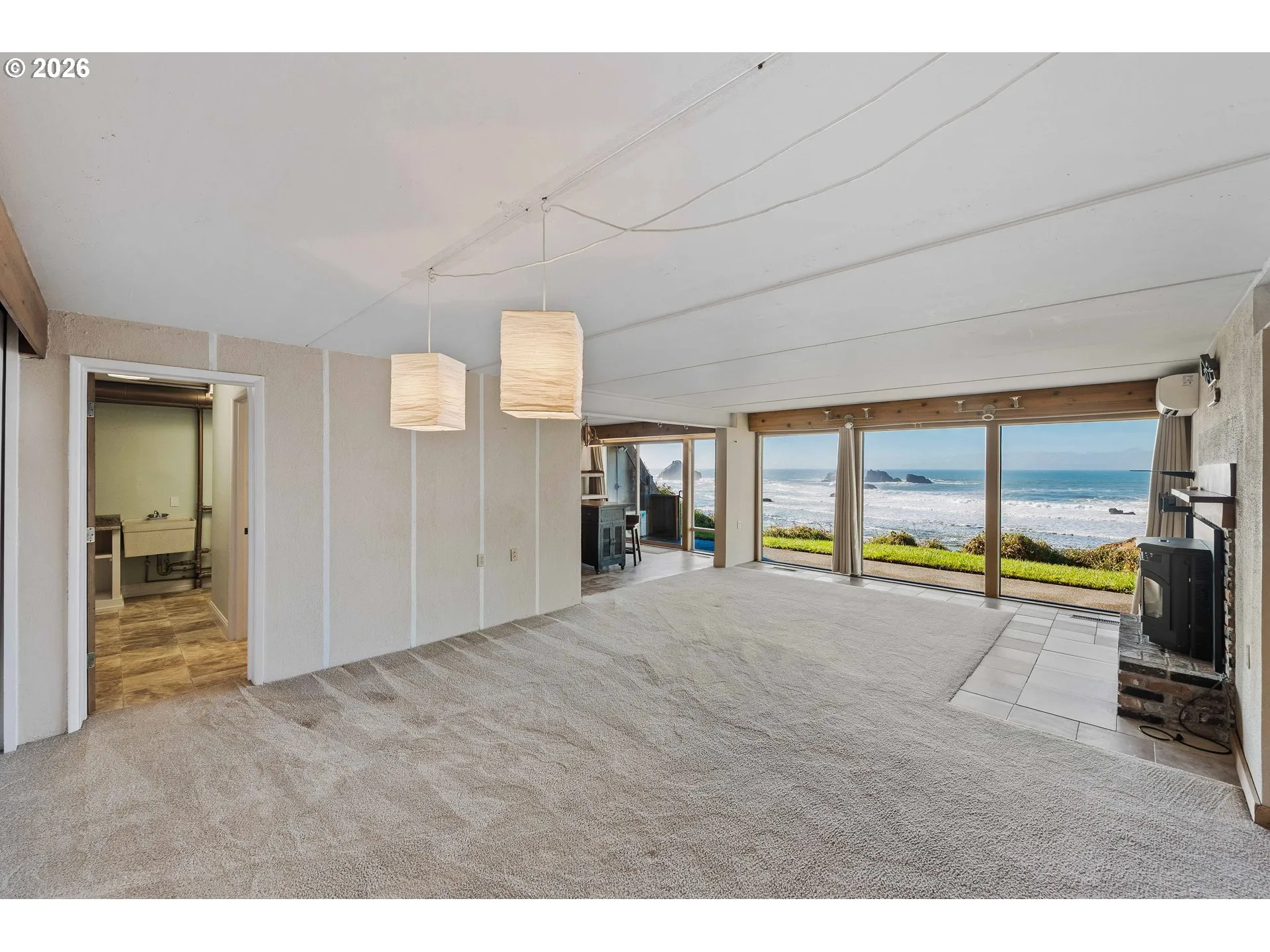 Oceanfront on Beach Loop in Bandon with commanding views of Coquille Point, Elephant Rock, and Face Rock—a front-row seat for sunsets and storm watching. Built in 1974, this coastal contemporary offers a daylight-basement / reverse-plan layout with a street-level garage and a separate laundry room (both with ocean-facing windows) and the main living spaces and bedrooms on the ocean-facing lower level. The living room features a fireplace with a pellet stove insert, and ocean-side windows and sliders keep the shoreline center stage year-round. Brand new roof (2024). Concrete lower-level construction provides a solid footprint. Convenient to Old Town Bandon shops and restaurants, the city park, library, and Bandon schools, plus an easy drive to Bandon Dunes Golf Resort and world-class golf. For buyers planning ahead, the street level offers potential to reimagine or expand—including the concept of building new above while retaining the existing concrete lower level, subject to buyer due diligence, engineering, and all required approvals/permits. A rare opportunity to own true oceanfront with iconic Bandon views.