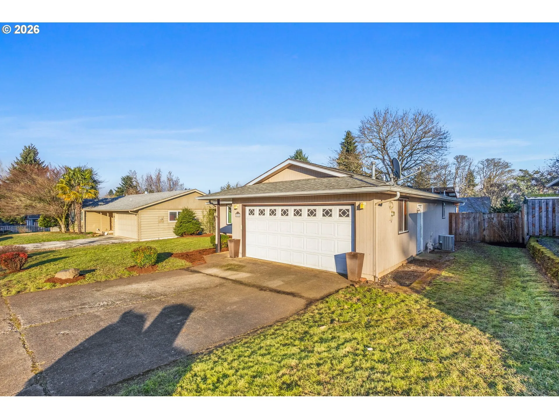 Single-level 1,454 sqft home located in a quiet South Salem cul-de-sac. *New roof to be installed prior to conclusion of sale*. Large, covered walkway leads to entrance with a covered atrium on front deck tucked into the side with its own kitchen entrance. Features include formal and casual dining areas, a covered backyard patio off kitchen, and a spacious living room with fireplace and beamed ceilings. Primary suite offers a walk-in closet. Just down the street from Crossler Middle School and Secor Park.This home really shines at night with great interplay between mid-century modern style windows and exterior lighting. Fully fenced and gated backyard ready for grass seed. Newer drainage system that that connects with gutter system and French drains. Lots of linen closets and a laundry/mudroom with utility sink. The home is perfectly set up to enjoy both back and front yard areas and the atrium compliments the natural flow of the layout. Vinyl windows and sliding doors.