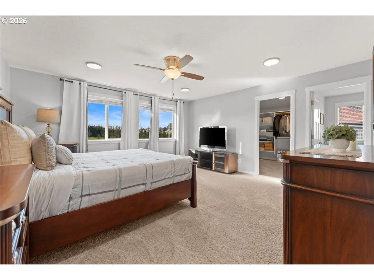 An exceptional property set on a level 2 acres offers a rare combination of a beautiful custom home, expansive grounds & an absolutely incredible shop! Contractors, hobbyists, car collectors, mechanics & entrepreneurs alike will appreciate the massive workshop equipped for serious use. The 45’x54’ shop features 3 roll-up doors, allowing drive-through access. Ideal for RVs, boats, car collections, inventory storage & creative pursuits. The shop includes it’s own bathroom w/tile shower, tankless water heater, utility sink + is prepped for HVAC installation. Sun-drenched & spotless, the house is completely move-in ready! Work from home in style in a bright, private office at the front of the house. Designed for both form & function, the generous kitchen will delight your inner chef, featuring wood cabinetry, sleek quartz countertops, walk-in pantry & modern engineered hardwood floors. The 2023 stainless steel KitchenAid suite includes a 5-burner gas range + built-in electric oven, all surrounding a generous island & eat-in bar. The heart of the home is the expansive, open-concept great room—ideal for hosting lively dinner parties, or curling up on a massive sectional for cozy movie nights. Escape to the primary suite w/high ceilings, generous walk-in closet, f/s tub, shower & 2 single vanities. A flexible 4th bedroom makes an excellent office, playroom, or craft space. Upstairs laundry adds everyday convenience (2023 Samsung washer & dryer included). Storage abounds throughout the home, shop & backyard shed. Set perfectly between Oregon City, Molalla, and Canby, w/access to Hwy 213, shopping, dining & major medical, while maintaining a peaceful small-town feel. Level, securely fenced w/garden & fruit trees & endless possibilities for a pool, sports court or play area. Located on a private cul-de-sac loop with friendly neighbors, colorful sunsets & no through traffic. This is a truly special property offering space, flexibility & exceptional amenities—inside and out!