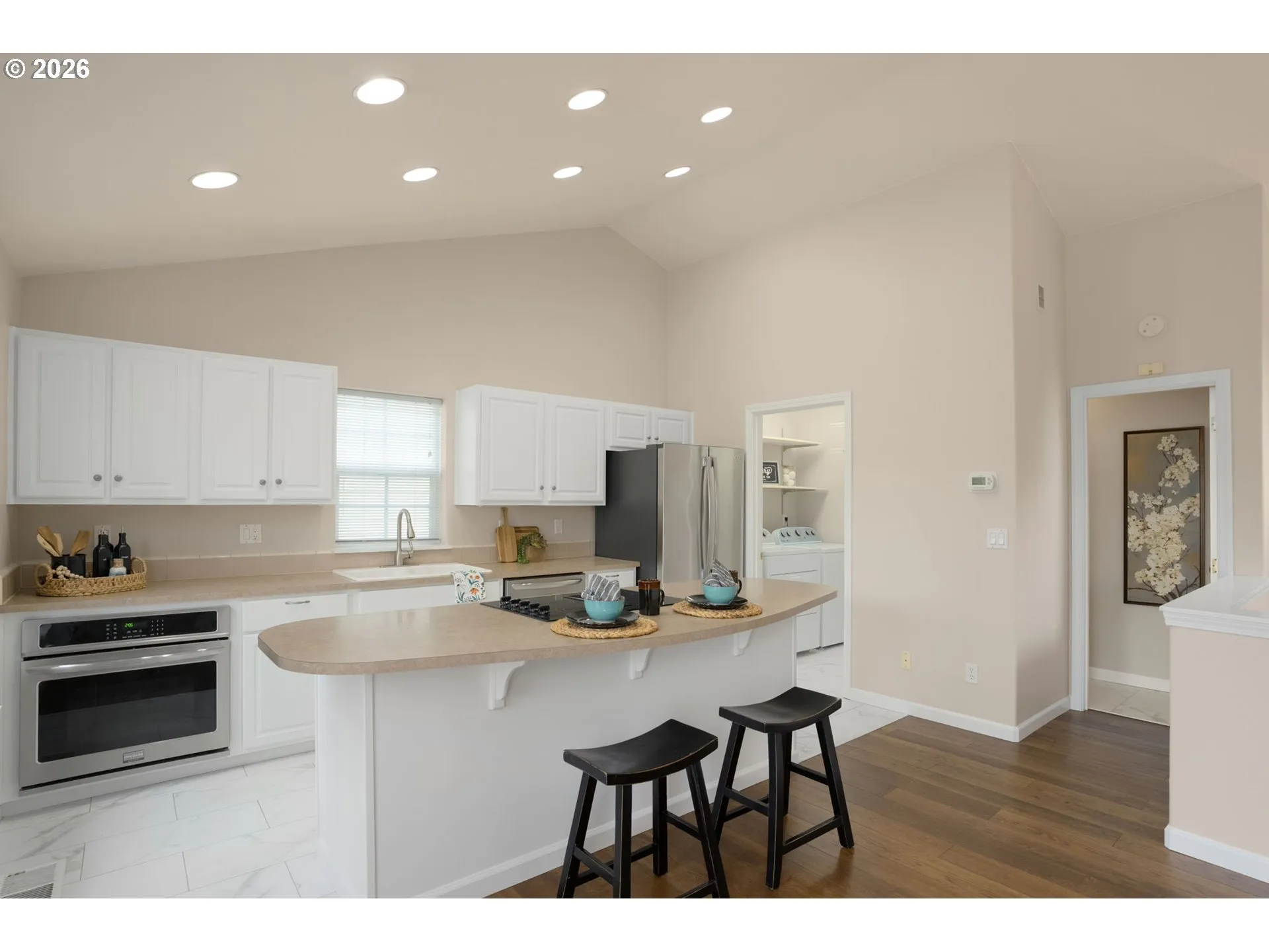 This private, quiet, light-filled end-unit townhome features soaring vaulted ceilings and a dramatic wall of north-facing windows overlooking your own serene nature sanctuary. The great room is bathed in natural light, creating an open, airy feel that seamlessly connects indoor living with the peaceful outdoor setting.As an end unit, this home offers direct access to a level yard and an expansive 30-foot patio, ideal for relaxing, entertaining, or simply enjoying the tranquil surroundings. Recent updates provide peace of mind including full plumbing re-pipe, fresh interior paint, and new flooring throughout. The exterior has been updated with new windows, doors, roof and decking in 2021.