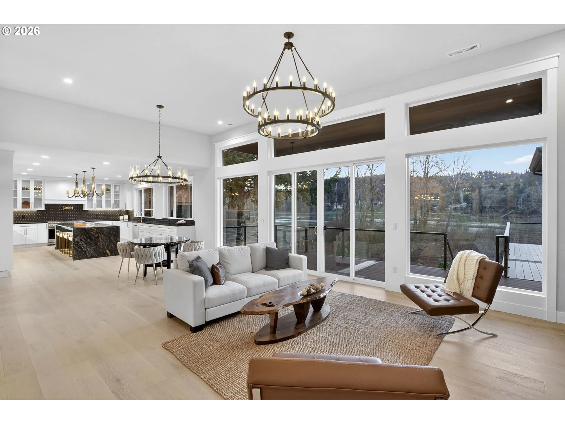 Prepare to fall in LOVE!! This exceptional riverfront home lives and feels like new construction, blending modern design with the natural beauty of the Willamette River. Privately set on a generous lot, the residence is thoughtfully designed to maximize light, flow, and connection to its surroundings.Expansive windows flood the main level with natural light while framing serene river views. The open living space is anchored by a striking gas fireplace with custom built-ins and flows seamlessly to a large deck ideal for entertaining, sunset gatherings, or quiet moments overlooking the water.The kitchen is both refined and functional, featuring a dramatic granite waterfall island, designer under cabinet lighting, high end appliances, and a spacious walk in pantry.The main level primary suite is a true retreat with sweeping river views, a private fireplace, and a spa inspired bath offering marble floors, a freestanding soaking tub, walk in shower, and oversized primary closet.The lower daylight level is perfectly suited for entertaining or multigenerational living, featuring a spacious family room with gas fireplace and wet bar complete with wine fridge and additional dishwasher. Double sliders open to a covered patio and backyard. Four additional bedrooms, a laundry room, and ample storage complete the level.Two attached garages including an oversized lower garage add convenience and flexibility. Enjoy private access from the backyard directly down to the river, offering a rare opportunity to connect with the water just steps from home. A public boat ramp located just minutes away provides easy access for boating and extended river recreation. With stunning finishes throughout and a setting that feels both private and connected, this is modern riverfront living at its finest.