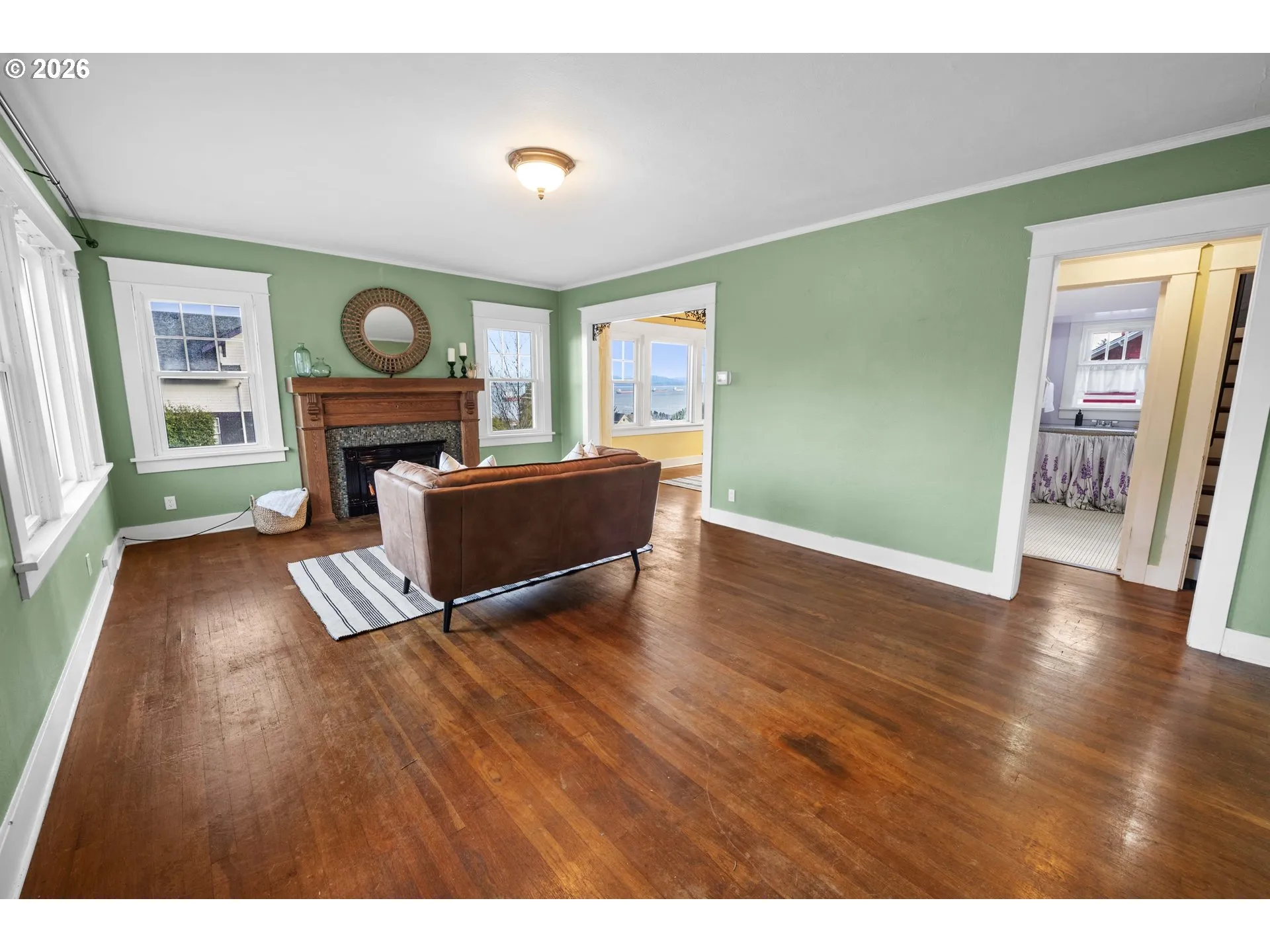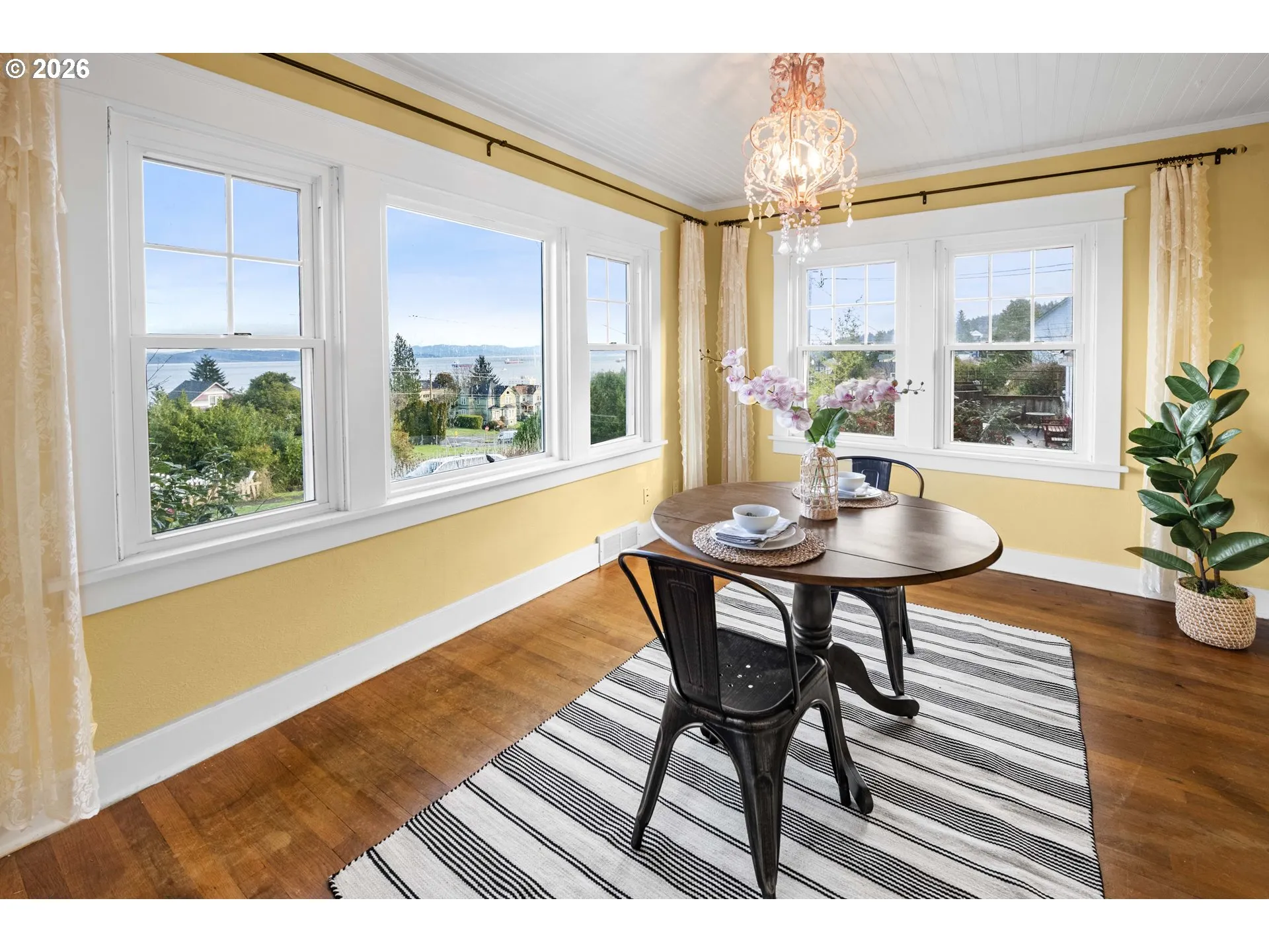 Perched above the street in one of Astoria’s classic hillside neighborhoods, this 1925 home features Columbia River views, morning sunrises, and the steady passage of ships – just minutes from downtown shops, dining, and the Riverwalk. Major updates add comfort and peace of mind, including a new roof (January 2026), oil tank removal, and conversion to a gas furnace, woodstove with blower and newer double-paned vinyl windows further enhance efficiency and livability. Updated kitchen has a cozy breakfast nook, tile floors, quartz countertops, and stainless-steel appliances. The spacious daylight basement offers excellent flexibility, with potential for a third bedroom, office, or bonus space, plus ample storage in the huge laundry room. Relax with your coffee in the sitting room, take in the passing ships, and enjoy the good life in Astoria.