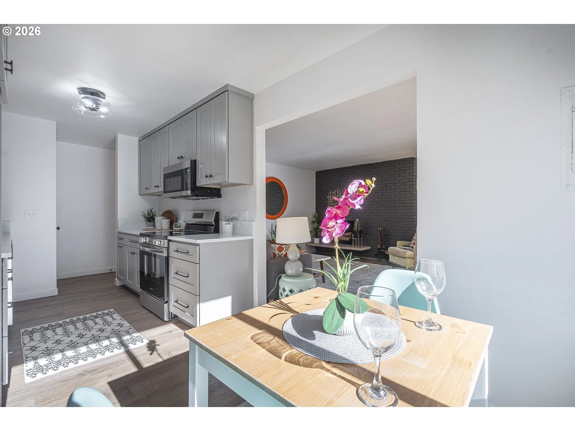 Welcome to this beautifully remodeled, ground floor mid-century modern condo! Every surface has been thoughtfully updated with quality finishes blending vintage character with modern comfort. The inviting living room features a cozy fireplace and opens to a covered deck overlooking a grassy yard, along with a private storage shed. A dedicated carport sits just steps from the front door for everyday convenience.Extensive 2026 improvements include new luxury vinyl plank & carpet flooring, fresh interior paint, updated windows, new cabinets, quartz countertops, sinks, and a refreshed bathroom with a new vanity, toilet, and tub/shower combo. The kitchen shines with a new range, dishwasher, microwave, and disposal. A new water heater and baseboard heaters wrap up the comprehensive upgrades.All of this is tucked into a quiet neighborhood close to town, shops, restaurants, schools, and freeways. Water, sewer, and garbage are included with the HOA. Don’t miss your chance to own this beautifully updated, like-new gem at a fantastic price!