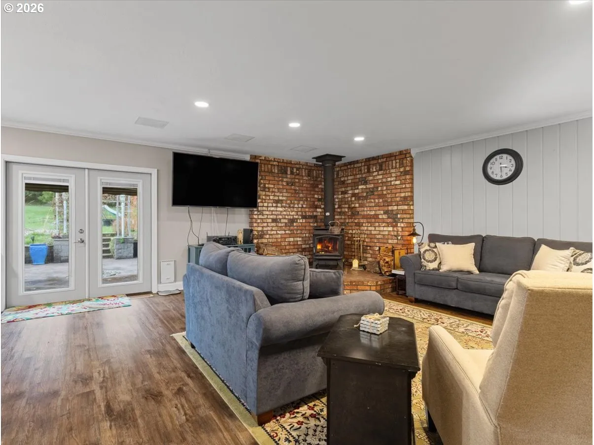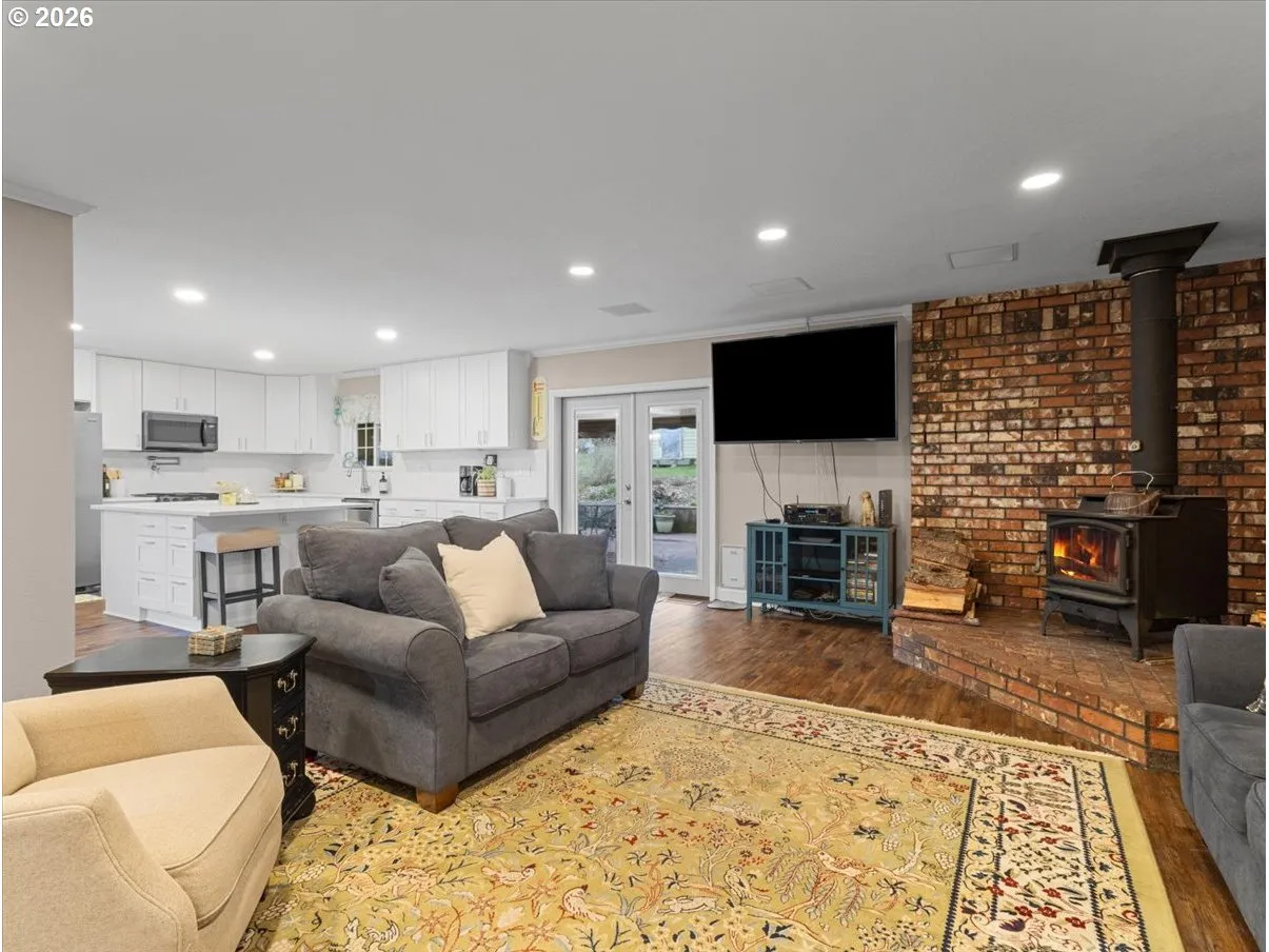 Well-maintained one-level home with 3 bedrooms and 3 bathrooms featuring an updated kitchen with extended shaker cabinets, quartz countertops, oversized island, stainless appliances, and walk-in pantry. Updated bathrooms include tile, quartz counters, dual sinks, and walk-in shower. Recent interior paint, new carpet, LED lighting, and quality finishes throughout. Large primary suite offers a walk-in closet, built-ins, and access to the enclosed hot tub area. Bonus loft approx. 18′ x 43′ provides flexible space and storage. Roof approx. 8 years old. Extensive parking with 3-car garage, RV parking, shops, barn, and multiple outbuildings/shop that are available to view. Fully developed backyard with outdoor kitchen, gazebo, gardens, greenhouses, and fruit trees.