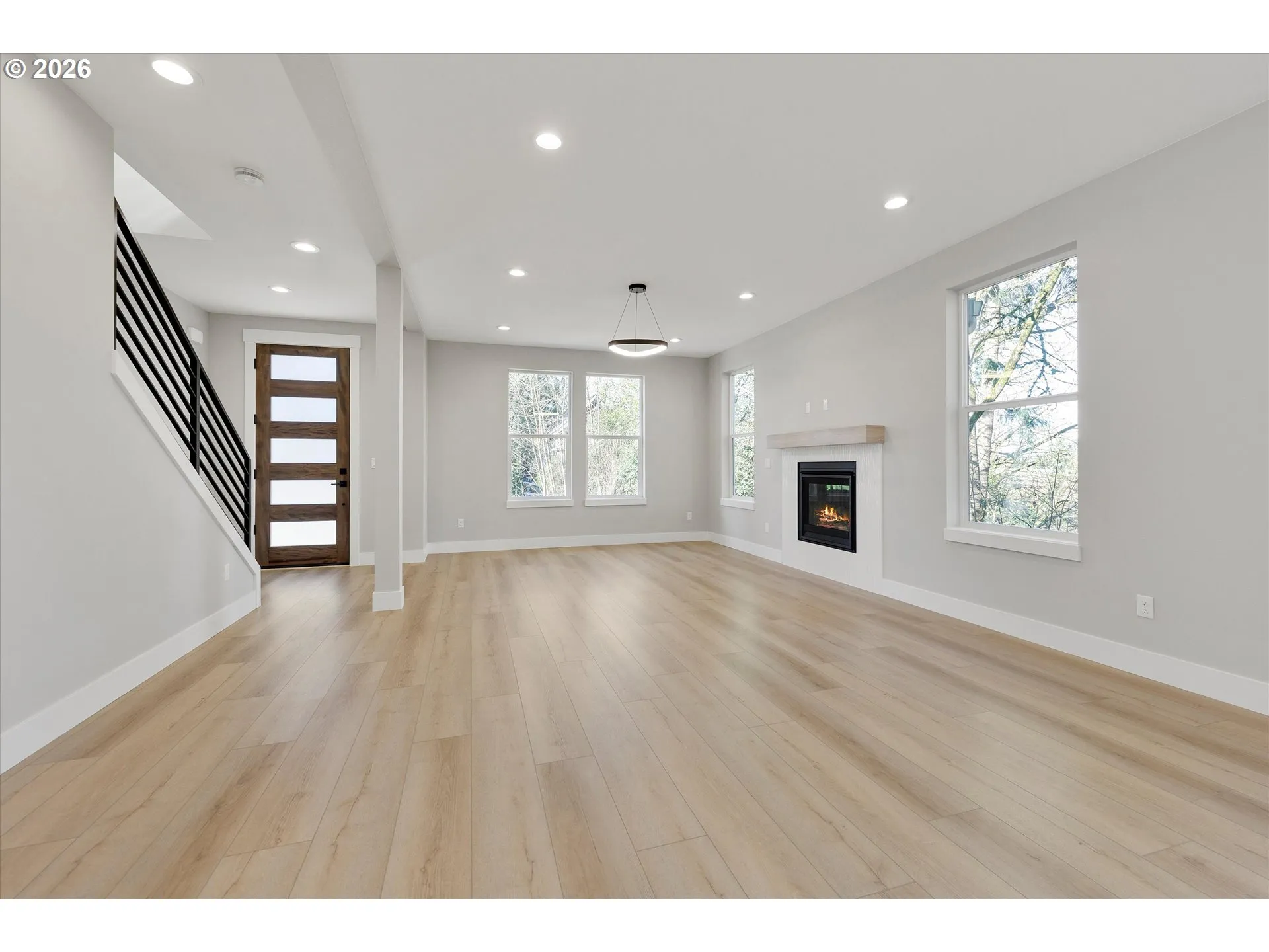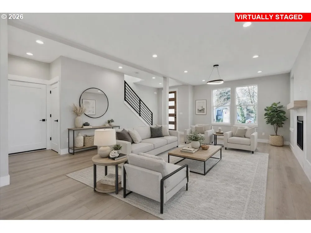 Discover this stunning new construction home set on an expansive 9,000+ sq. ft. lot, offering exceptional privacy and a tranquil, green-buffered setting. From the moment you step inside, an abundance of windows fills the home with natural light and frames serene outdoor views, seamlessly blending indoor and outdoor living. Thoughtful design and meticulous craftsmanship are evident throughout. The open-concept main level effortlessly connects the bright great room with a cozy fireplace, the formal dining area, and the beautifully appointed kitchen—perfect for both entertaining and everyday living. An oversized sliding door extends the living space to a generous covered patio with a BBQ gas hook up, and backyard ideal for relaxing or hosting gatherings. The kitchen features custom cabinetry with under-mount cabinet lighting , quartz countertops, a full suite of stainless steel appliances including refrigerator, and a pantry. Durable laminate flooring flows throughout the main floor, adding style and functionality. Ascend upstairs via a stair case with custom metal railings and step into a sunlit-high ceiling hallway leading to three spacious bedrooms. The primary suite with vaulted ceilings offers a large walk-in closet and a spa-inspired bathroom with a walk-in shower, dual vanity, and heated tile floors. Additional bathroom upstairs also feature heated tile flooring for year-round comfort. Practical amenities enhance everyday living, including a spacious laundry room with built-ins, central heating and cooling upstairs, and a mini-split system on the main level. The oversized garage is car-charger prewired, and equipped with a quiet garage door opener. A dead-end ally behind the lot, and no neighbors peeking in from every direction! Ideally located just minutes from downtown Vancouver, this home provides easy access to shopping, dining, entertainment, and quick freeway access makes it a commuter’s dream. Builder’s warranty and seller’s concessions are available.