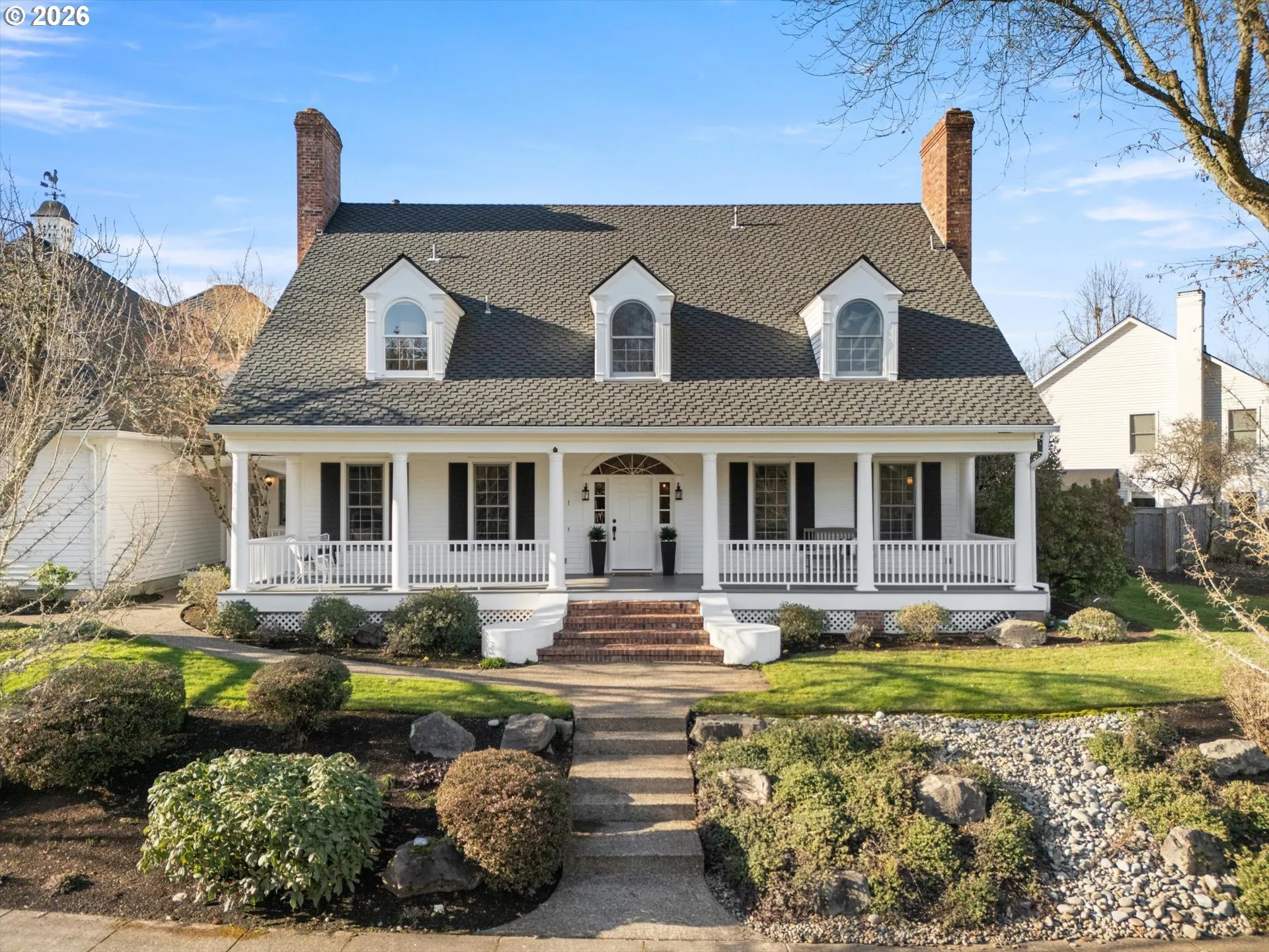 OPEN HOUSE 2/15 12-2:00PM This one-of-a-kind custom Colonial home, sits on a curved 1/3+ acre lot with a 40-foot covered front porch. The spacious, flexible layout includes two primary suites, with a main-level retreat ideal for guests or multi-generational living. Formal living and dining rooms offer classic entertaining space, while the vaulted family room with hardwood floors features one of five masonry wood-burning fireplaces with gas assists. A private office with built-ins and a large bonus room provide space for work or play. The kitchen is the heart of the home with quartz countertops, stainless steel appliances, large island with 5-burner gas cooktop, pantry, and sunny bay-window nook. The main-level primary suite includes a soaking tub, walk-in shower, custom closet, and private patio. Upstairs offers a second suite, two bedrooms with Jack-and-Jill bath, and a large laundry room with storage and utility sink. The home also has 2 tankless water heaters, 2 furnaces, and 2 AC units. Fully fenced, landscaped backyard with covered patio and 3-car garage. Located in award-winning West Linn schools.