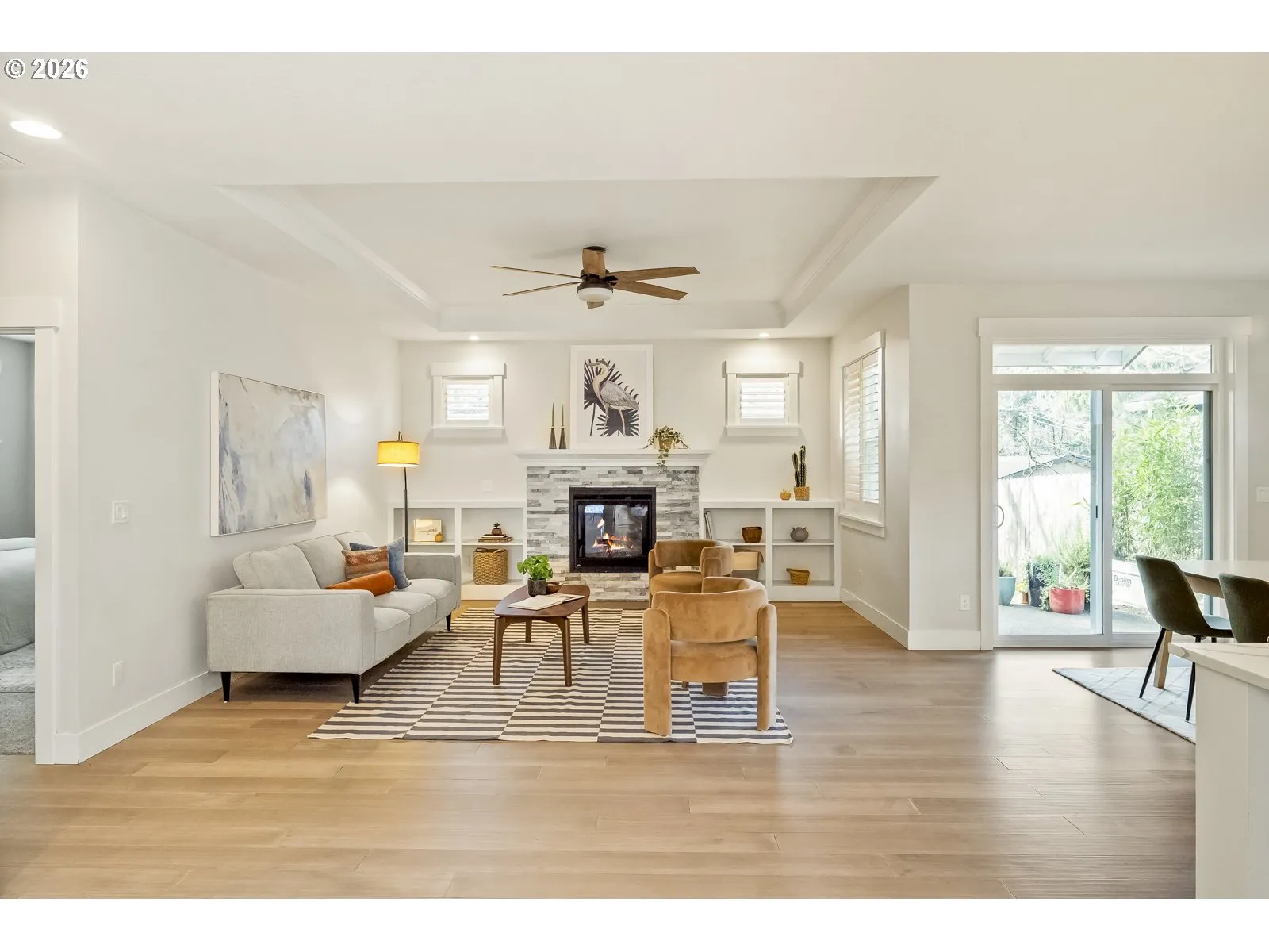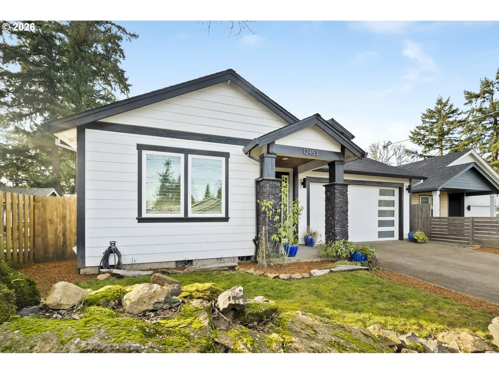 A true commuter’s dream with easy access to Portland and the Orange MAX line, this tranquil one-level home is nestled on a quiet street and thoughtfully designed with style, function, and quality in mind. As you walk in, you are greeted by a stately hallway with high ceilings throughout that leads to an inviting open great room—perfect for entertaining—featuring a spacious kitchen with a newer stainless steel refrigerator, Bosch dishwasher and stunning quartz island that flows seamlessly into the dining area and family room, complete with a cozy fireplace and custom built-in bookshelves. The gorgeous primary suite offers comfort and privacy and features an ensuite bathroom and walk-in closet, while the front bedroom with French doors gives you the option for an ideal home office or den. Enjoy brand-new carpet, A/C for year-round comfort, and a fully fenced and landscaped backyard that feels wonderfully private, surrounded by mature oak trees and fragrant lilacs. [Home Energy Score = 8. HES Report at https://rpt.greenbuildingregistry.com/hes/OR10205803]