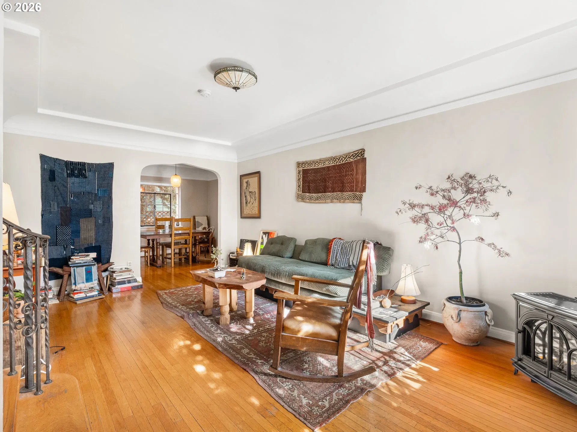 Built in 1928 during an era when architecture embraced curves, natural light, and thoughtful design, this residence was designed by noted architect Carl Linde and is recognized on the National Historic Register. It blends timeless character with carefully integrated modern updates — striking a balance that feels both authentic and effortless. Southern-facing windows invite in abundant natural light, illuminating warm hardwood floors, soft archways, and a gracefully curved staircase accented with decorative wrought-iron detailing. The spaces feel welcoming and intentional, defined by architectural form rather than fleeting trends. Upstairs offers a peaceful retreat, with bedrooms kept comfortable year-round by newer mini-splits and mornings that begin softly in filtered light. The main level is designed for gathering, anchored by a freestanding Jøtul gas fireplace and flowing naturally into a thoughtfully updated kitchen featuring stainless steel appliances and a five-burner gas cooktop — where modern function meets enduring charm. Situated within a secure, gated courtyard framed by lush landscaping and a tranquil water feature, the home also includes storage, bike amenities, and shared community spaces that create both convenience and connection. Just beyond the gates, Portland unfolds — cafés, vintage shops, neighborhood grocers, and effortless access to the beloved Kerns district, all within a few blocks, complemented by an impressive 100 Bike Score and 96 Walk Score. Light-filled and architectural. Warm, storied, and unmistakably Portland. Ready to welcome its next chapter.