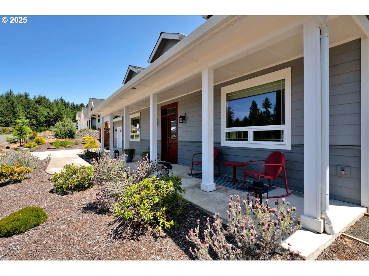 Like new home in the gated, private Woahink Lake neighborhood of Sunset Cove. Great views of the lake and a shared community dock give you endless opportunities to delight in one of Florence’s most popular lakes, while only ten minutes from town. When you aren’t at the lake, savor your half acre lot that includes Fuji apple trees, blueberry bushes and an array of quality landscaping. The privacy of the covered back patio will give you a space to enjoy all year long. Inside you’ll find a fully furnished home that exudes a modern color scheme and consistent decor throughout. The open floor plan with vaulted ceilings and electric fireplace is the perfect setting for the end of a day on the lake or a cozy evening in on a rainy day. Spacious primary suite with patio access and roomy walk-in closet on one side of the house and two bedrooms and full bath on the opposite side. A kitchen made for cooking and entertaining with a sizable island that opens to the great room. Come & see why the lake areas of Florence are desired.
