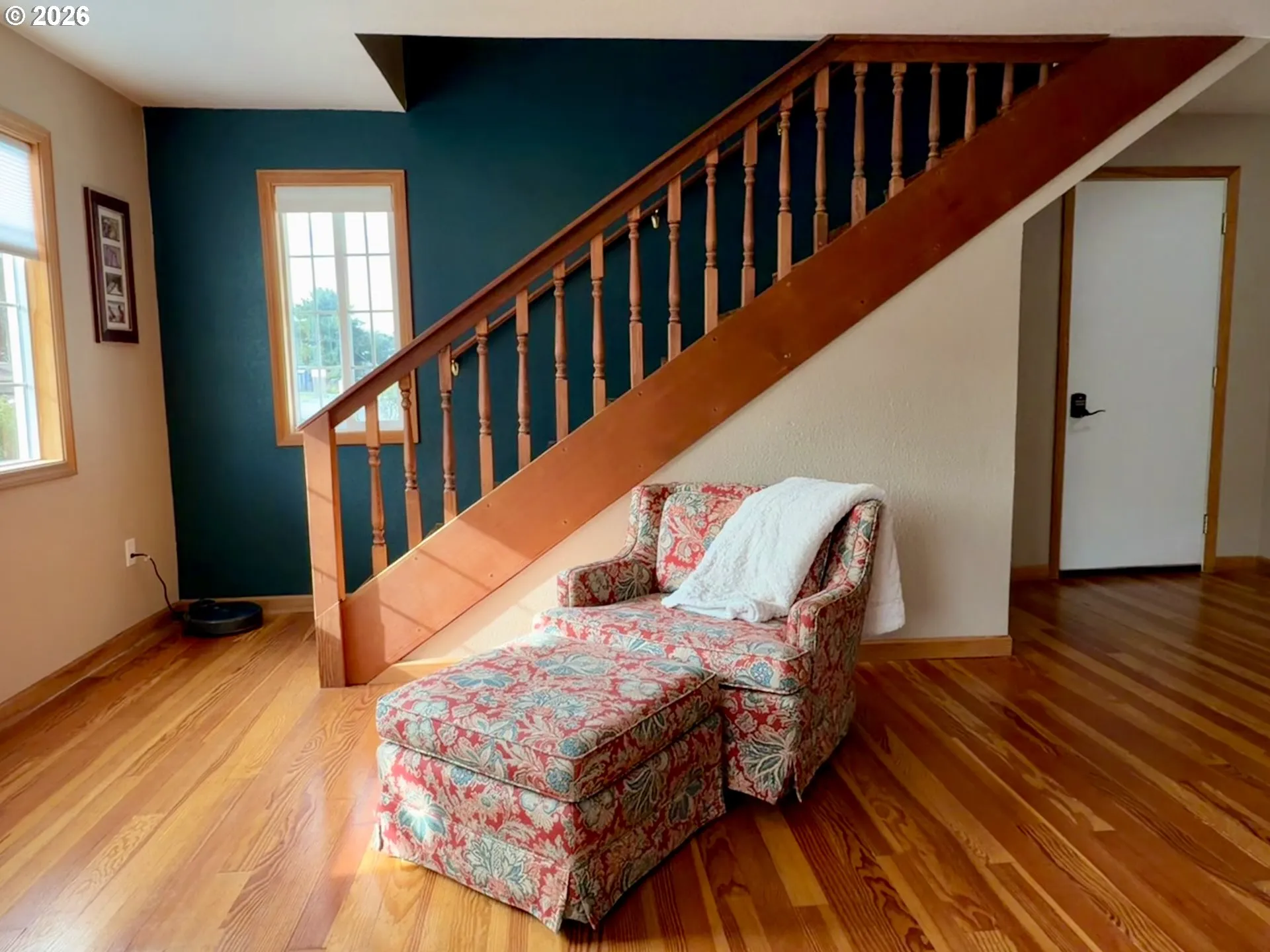 Charming cottage-style home in a convenient Hwy 101 location with easy front parking and additional alley access behind for more cars or RV parking. This inviting two-story, 1,168 sq ft home offers 2 bedrooms and 1 bath, featuring a galley kitchen with solid countertop and natural wood cabinets. a separate dining area, and a dedicated laundry room. The comfortable living room is warmed by a cozy pellet stove, creating a welcoming space to relax.The primary bedroom and bathroom are located on the main level. Upstairs, you’ll find an additional bedroom and a cozy sitting room, perfect for reading, relaxing, or creating a small office space. Unfinished attic area approximately 12×10 with a high ceiling offer extra storage or potential for future 2nd bath or future bedroom. The attached one-car garage runs the length of the home, providing excellent storage or workshop possibilities. Step outside to enjoy the spacious back deck overlooking the yard and parking area—ideal for outdoor gatherings or quiet evenings.Conveniently located just 1/4 mile to grocery and shopping, and approximately 1.5 miles to Bandon South Jetty Park beach access, this home offers comfort, character, and a great location.