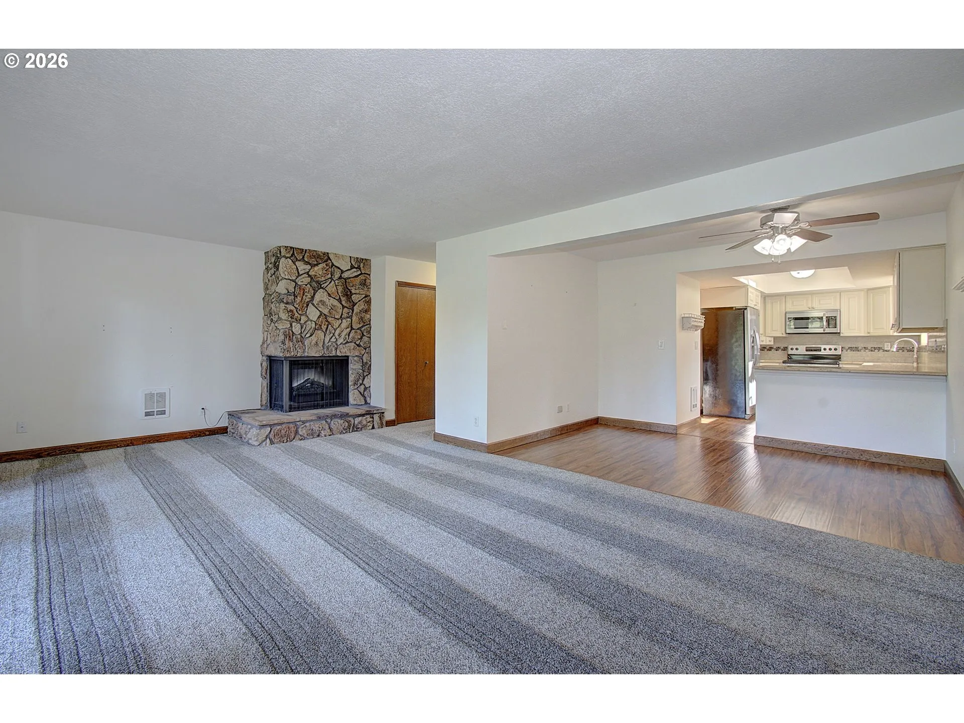 Welcome home to this beautifully updated condo overlooking the Mint Valley Golf Course (View of the 11th Fairway behind) where peaceful views and easy living come together. From the moment you step inside, you can feel how thoughtfully this home has been cared for and improved over the years. The main living space is light and welcoming, featuring newer flooring, a cozy fireplace, and access to a spacious covered deck with golf course views. It is the perfect spot to unwind, enjoy your morning coffee, or relax in the evening while watching the course change with the seasons. The kitchen has been recently remodeled and offers upgraded cabinetry, granite countertops, and comes fully equipped with all stainless appliances. Interior laundry including newer washer and dryer. Everything you need is already in place, making this home truly move in ready. Upstairs, the oversized primary bedroom feels like a retreat of its own, complete with a private large covered deck overlooking the golf course and a remodeled ensuite bathroom with a walk in shower, new cabinetry, granite counters, and a bright, fresh feel. A second full bathroom upstairs has also been updated, adding convenience and comfort with an attached additional room with a window and heat source offers flexibility for a walk in closet or bonus space. This condo is also the only unit in the complex featuring two decks, providing rare and valuable outdoor living space. Parking is easy with a single car garage with opener plus an additional covered carport located adjacent to unit. The HOA provides exterior and grounds maintenance, sewer, and trash, allowing for low maintenance living while enjoying a well cared for community. With golf course views, extensive updates, and a layout that offers both comfort and flexibility, this condo offers a special opportunity to enjoy a relaxed lifestyle in a scenic setting. New Roof-2021. Only unit including 2 Decks! Mini Split offers comfort year round.