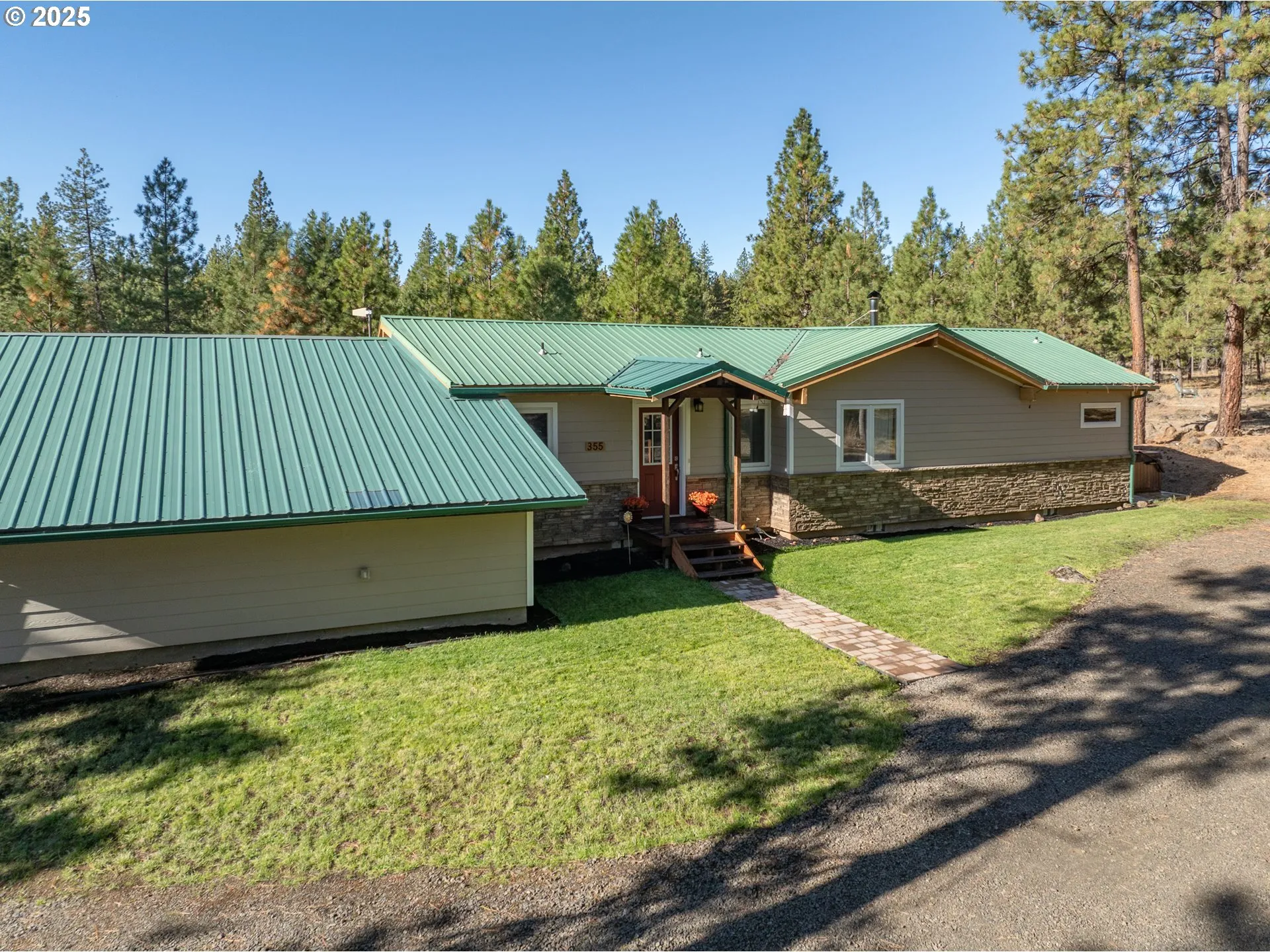 Welcome to Wooded Haven, a ranch-style custom home on just over five acres with a practical layout, durable materials, and multiple flexible spaces. The exterior features fiber-cement siding with fieldstone accents, a metal roof, and composite decking. The property sits on a quiet dead-end street surrounded by mature pine and oak trees that provide privacy and shade. Inside, the open-concept great room includes vaulted ceilings, Hemlock trim, a woodstove on a slate hearth, and large windows that bring in natural light. Hydronic radiant floor heating and mini-splits provide efficient year-round comfort. The kitchen has granite countertops, Hickory cabinetry, a farmhouse sink, undercabinet lighting, stainless steel appliances, and a skylight. The dining area flows onto a deck bordered by a green lawn with views of the surrounding trees. The primary suite has a private deck, tall picture window, skylight, and a spa-style walk-in tile shower with a rain head. Both bedrooms have bamboo flooring. A 480 sq ft heated and insulated flex room with windows and double doors offers options for a third bedroom, office, gym, or workshop. This former garage now functions as enclosed living space, while two driveway areas and a circular drive provide ample parking. Outbuildings include a powered roll-off-roof observatory with an insulated warm room, heat and A/C, motorized roof, and removable telescope piers, along with a garden shed and additional storage areas. The property attracts regular wildlife activity and offers open areas for gardening or outdoor projects. Dark skies make the location suitable for stargazing. The neighborhood is quiet and lightly traveled, with residents