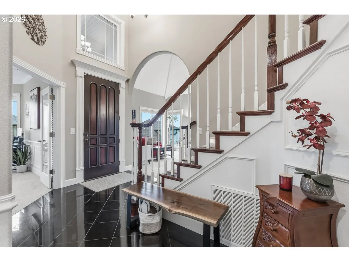 Welcome to this beautifully maintained and thoughtfully updated four-bedroom, two-and-a-half-bath custom home, ideally situated on a corner lot in the highly desirable Morningstar neighborhood. Backing up to protected Bull Mountain Park, the property offers a rare sense of privacy along with territorial and Mt. Hood views creating a truly serene setting. A grand entry sets the tone with marble flooring, striking staircase, and soaring ceilings that reflect the quality and care found throughout the home. Light-filled interior features vaulted and high ceilings and a well-balanced floor plan offering formal living and dining rooms and a spacious family room. The updated kitchen showcases quartz countertops, subway tile backsplash, updated stainless steel appliances, a walk-in pantry, and a generous cooktop island with eating bar anchored by the new Jenn-Air gas cooktop (2025). The primary suite is a peaceful retreat with vaulted ceilings, a walk-in closet, dual sinks, a jetted tub, a resurfaced shower with sliding glass doors, and private balcony—perfect for enjoying morning light and tranquil views. Outdoor living is a true highlight. The backyard has been meticulously designed with custom hardscape, elegant patio and walkway features, a tranquil koi pond & waterfall that enhances the Zen-like atmosphere. Backing to protected greenspace, this private oasis is ideal for relaxing or entertaining while taking in the natural surroundings and full Mt. Hood views. Additional exterior amenities include a deck and patio, natural gas BBQ hookup, an extensive rose and Japanese gardens and in-ground sprinklers. Extensive system and cosmetic updates provide peace of mind, including a Carrier hybrid heat pump and A/C (2020), R-49 insulation with upgraded exhaust fans, a Reliance 75-gallon gas water heater (2024), new carpet with upgraded pad, refreshed interior paint, new 6” recessed lighting throughout.
