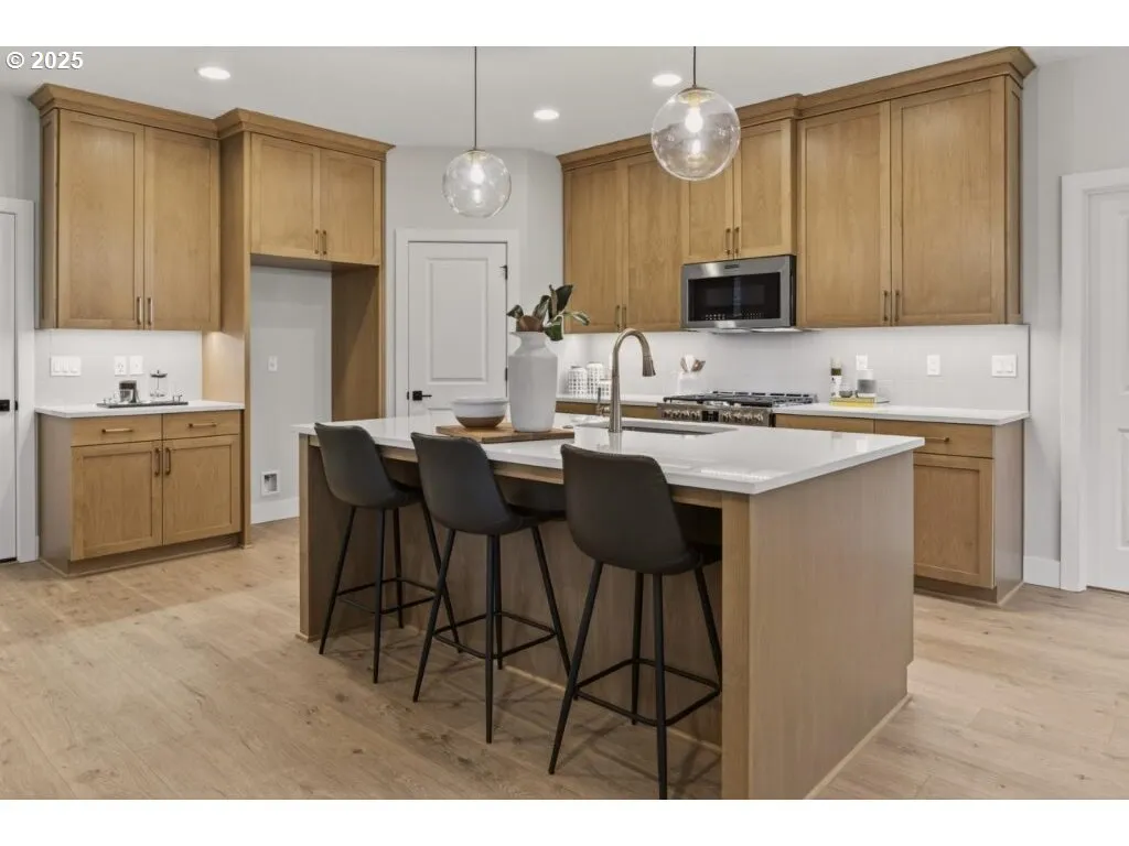 This move-in ready, spacious 4-bedroom, 3.5-bath residence is designed for versatility, featuring two primary suites—including a flexible main-floor option—plus an upper-level loft and a main-floor powder room. The heart of the home is an extended gourmet kitchen outfitted with 42-inch custom-stained shaker cabinets, champagne bronze hardware, slab quartz countertops, and a full suite of Frigidaire Professional Series appliances (range stove, built in microwave, and dishwasher). The adjacent great room, anchored by a shiplap-accented masonry gas fireplace, flows seamlessly to an outdoor oasis. Enjoy ultimate privacy with no rear neighbors, as your fully fenced yard and landscaped grounds back directly to lush green space. Entertaining is effortless on the enhanced Trex deck and covered patio, which features a built-in BBQ gas line for year-round grilling. Modern essentials abound, including a full laundry room with a sink, a 3-car garage with a washer/dryer rough-in (complementing the interior hookups), Smart Home technology, and Air Conditioning. Protected by a comprehensive builder warranty. Excellent schools and convenient location for shopping, activities and more. Experience the refined living in this professionally staged masterpiece nestled in Tigard’s premier River Terrace Crossing community at Bull Mountain. Ideally situated for easy access to regional employment hubs, this neighborhood offers a sophisticated lifestyle defined by scenic trails, manicured green spaces, and local shopping. Ask about our special financing and/or closing costs if financing with preferred lender.