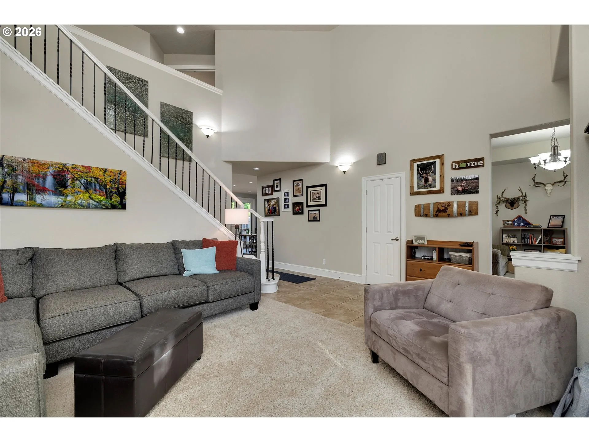 Step into a grand foyer with soaring ceilings in this thoughtfully designed home. The main level features a welcoming living room, additional family room, and a flexible space for an office or formal dining. A main-floor bedroom adds convenience for guests or multi-generational living. The kitchen offers updated tile flooring, abundant storage, an island, oversized dining area, plus a 2023 refrigerator, 2024 dishwasher, and updated stovetop (2022). Upstairs includes newer carpet (2020) and a spacious primary suite with vaulted ceilings, gas fireplace, double vanity, walk-in closet, walk-in shower, and bonus workout space. A vaulted bonus room provides flexibility for media, play, or lounge. Additional highlights include Cat 5 wiring, a new water heater, utility sink in the laundry room, and a three-car tandem garage. Enjoy outdoor living with a massive covered patio, natural gas BBQ hookup, low-maintenance turf, fresh exterior paint (2022), and a powered 9×12 shed.