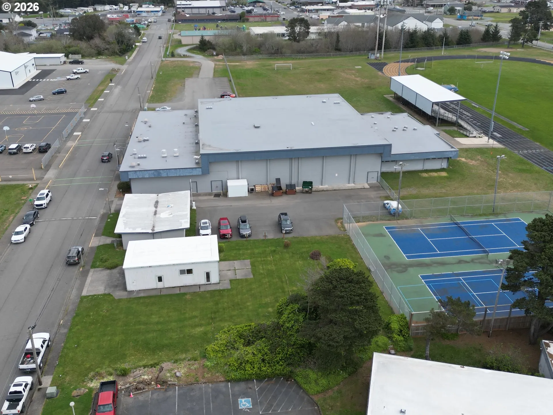 SHOP BUILDING on large lot, adjoins Bandon Schools, 9600 square feet, Tall Garage Door, Water and Sewer Available.