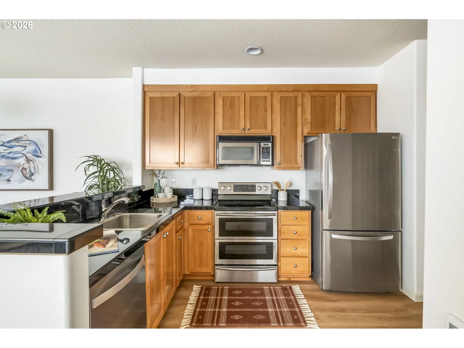 This bright and inviting corner unit in desirable Elmonica Station is single level living at its finest! Step inside to discover a comfortable open-concept main living space with oversized windows that bathe the property in light. The recently updated eco-friendly SPC flooring and stylish upgraded light fixtures add a contemporary touch. High ceilings give the home a spacious feel well beyond its footprint. The comfortable kitchen offers plenty of space to cook and is equipped with newer stainless steel appliances. The bathroom has been tastefully updated with finishes that are both contemporary and classic. Enjoy your own private covered porch- perfect for relaxing with a morning coffee or unwinding at the end of the day. The in-unit washer/dryer, convenient deeded parking space, and desirable community location tucked into the quiet interior are all icing on the cake! Ideally located just 1.7 miles from the Nike World Headquarters and 3.1 miles from Intel, this home is also close to shopping, parks, and dining. It is situated adjacent to the Elmonica MAX station, offering exceptional transit access. A wonderful opportunity for those seeking a low-maintenance home in a convenient and well-connected location.