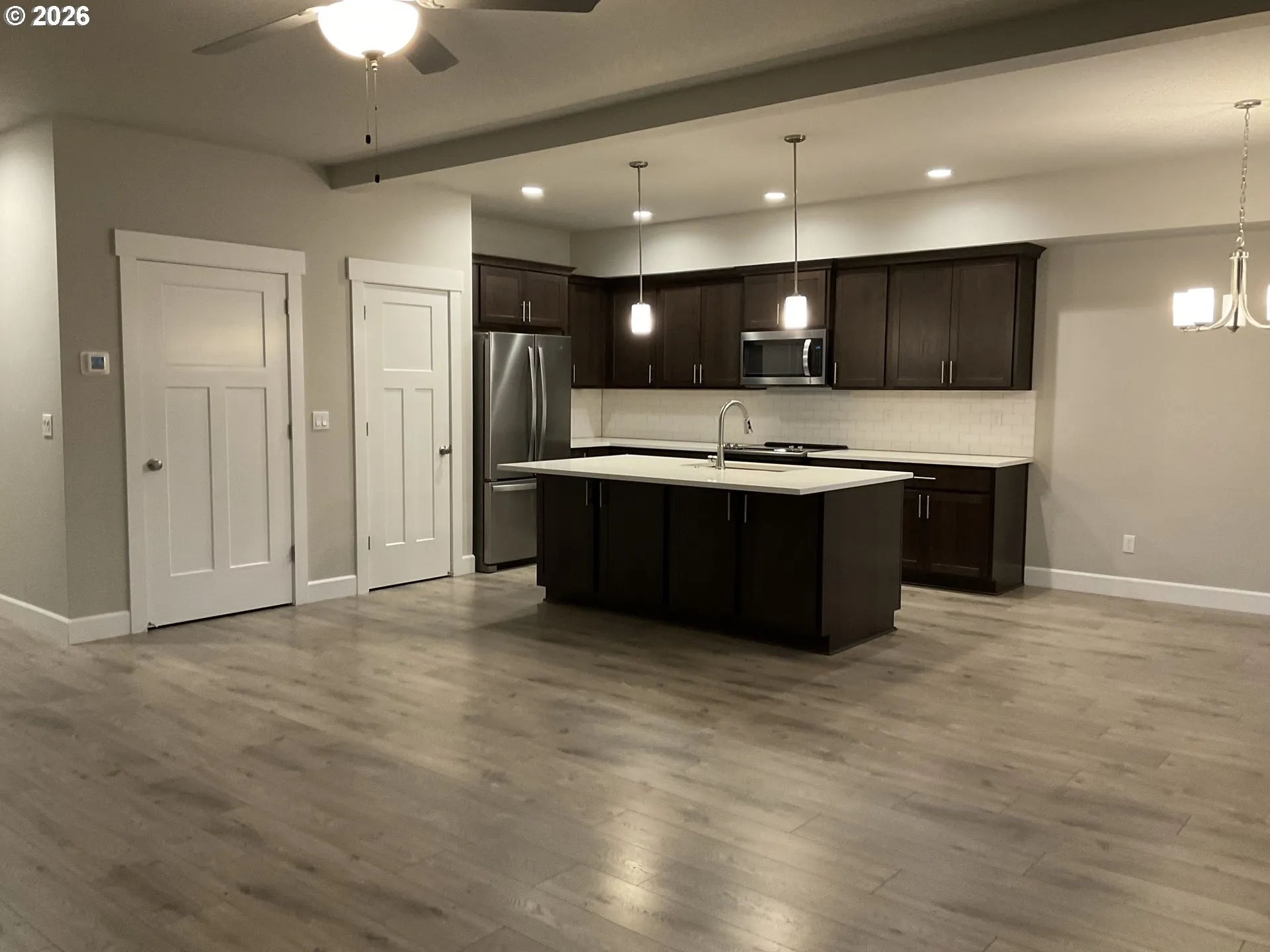 Fantastic floor plan with a fully attached ADU—perfect for multigenerational living or added income potential. The main home features 4 bedrooms and 2.5 baths, while the ADU offers its own private entrance, 2 bedrooms, 1 bath, a full kitchen, living space, 1-car garage, and a dedicated laundry room. Both the main home and ADU feature laminate flooring, quartz countertops, and stainless steel appliances, giving the home a clean, modern feel throughout. Step out back to a low-maintenance deck and a thoughtfully designed with fenced areas—providing privacy and functionality for both the main home and ADU. Perfect setup for dual living, guests, or rental income—or simply enjoy a spacious home with 6 total bedrooms.