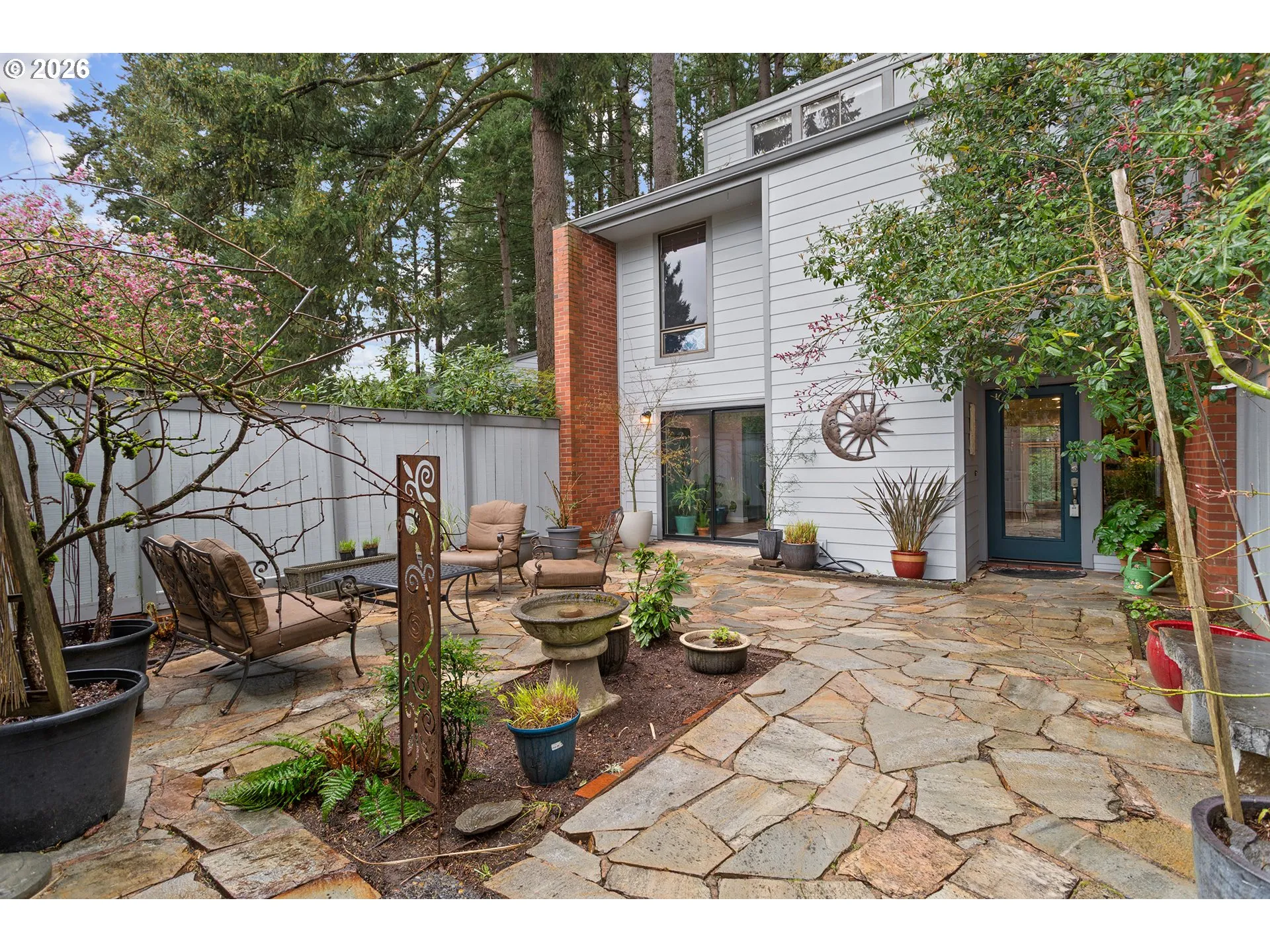 Charming 1970 townhome features 1660 square feet of living space, 3 bedrooms all with vaulted ceilings, owner suite with partially covered balcony, sitting area with balcony, third floor has light and bright loft area suitable for office, yoga, etc. Main floor features brick floors, half bath, laundry, cozy kitchen, pantry, stainless steel appliances & range hood and eat bar is open to dining area with a slider to private enclosed flagstone courtyard and access to your 2 car garage. Forced air gas heating and central air conditioning for year around comfort, Google Thermostat. Front door is coded. Large living area with brick floors, gas stove, can lights, wall of windows and a slider a covered brick outdoor sitting area and view of a wonderful treed park like area. Newer fiber-cement siding and gutters. Enjoy HOA amenities swimming pool, clubhouse w/ full kitchen, meeting rooms, restrooms, chairs and umbrellas, landscaping and exterior insurance coverage, walking/bike trails to name a few.