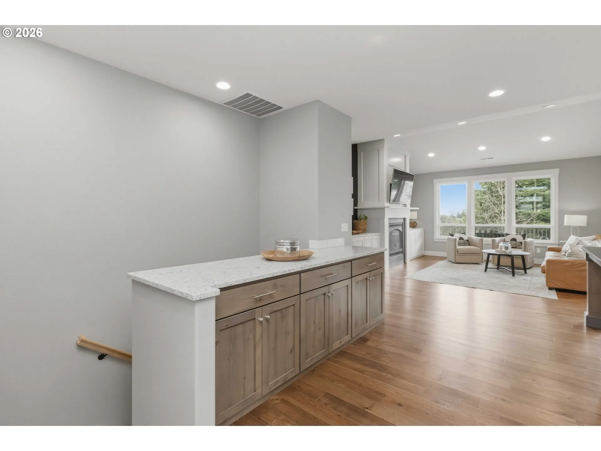 Custom-built 5-bedroom, 3-bath home with a versatile bonus room, sweeping views, and a thoughtfully designed layout filled with natural light throughout. The open kitchen and great room anchor the main level, centered around a gas fireplace and designed for both comfort and connection. Alder cabinetry, a generous granite island, quartz countertops, and a dual-fuel range (gas cooktop, electric oven) create a kitchen that blends function with understated elegance. The main-level primary suite offers a spacious walk-in closet, oversized walk-in shower, and Atrium doors opening to a Trex deck—an ideal place to take in the surrounding views. Two additional bedrooms and a full bathroom on the main level provide flexibility for guests or everyday living. The lower level extends the living space with a large family or game room featuring a wet bar, along with two bedrooms and a spacious bathroom with a walk-in shower—well suited for guests or multi-use living. A generous laundry room offers space for hobbies or crafts and includes a specially built storage room of over 400 square feet, providing exceptional organization and flexibility. Nine-foot ceilings throughout both levels enhance the sense of space, complemented by prefinished engineered oak flooring and quality finishes. Additional features include a zoned gas furnace with dual thermostats, natural gas, and an on-demand water heater. A fully fenced backyard, expansive deck, and RV parking with 50-amp service complete the home.