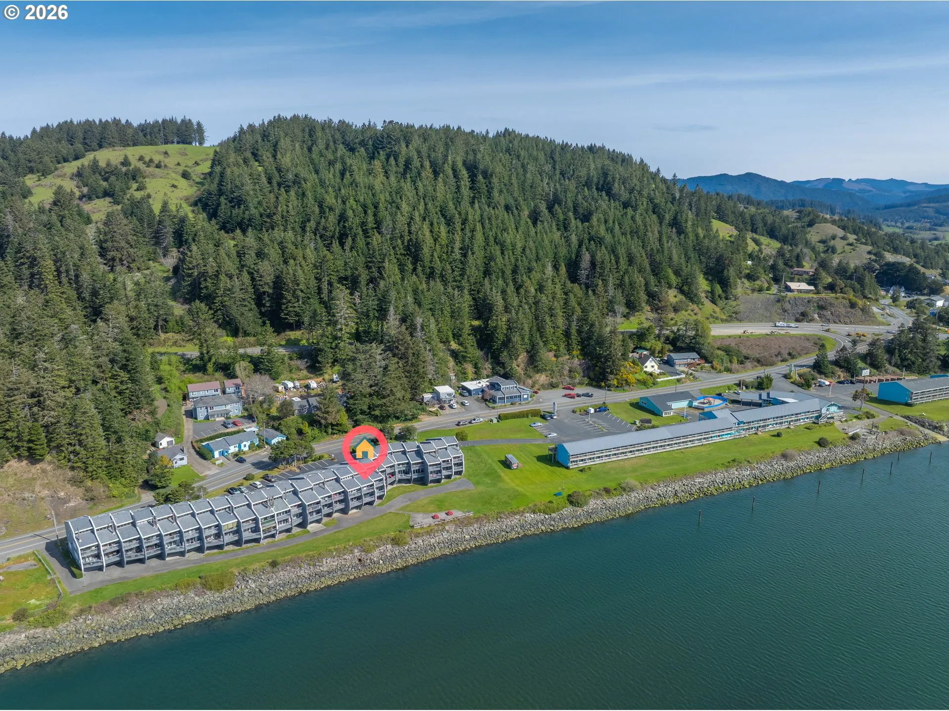 Enjoy elevated coastal living with sweeping views of the Rogue River & Pacific Ocean from this upper-level condo in Gold Beach. This unit offers a versatile layout with one bedroom on the main level & a loft-style second sleeping area accessed by a spiral staircase. A less common configuration in the complex, as many units feature loft space only without a main-level bedroom. Offered fully furnished, this condo is truly turn-key. Previously utilized as both a short-term & long-term rental, it comes equipped with the furnishings & essentials needed to continue generating income or to enjoy as your own coastal retreat. The living area features an electric fireplace with remote for added comfort, while a stacked washer/dryer add convenience. Step out onto the private balcony—perfect for relaxing or BBQing & take in breathtaking views. Gold Beach is world-renowned for its exceptional fishing, primarily for salmon and steelhead on the Rogue River. Watch fishing boats head out at sunrise and catch Jerry’s Jet Boats passing by throughout the day. Located just across the Rogue River, this condo offers quick access to town, local shops, dining, & beaches while maintaining a more peaceful, tucked-away setting. A 258 sq ft extra-deep garage/storage space is located beneath the complex. While not suitable for a vehicle, it offers excellent storage & is easily accessible via a paved drive from the west side of the building. HOA dues are $1,129.25 per quarter ($949.25 + $180 sewer pass-through) & include basic cable TV, WiFi, water, sewer, trash, landscaping, exterior maintenance, common areas, & access to a meeting room providing low maintenance ownership & added value. Seller may consider owner carry with approximately 30% down, competitive interest rate, & negotiable terms. Buyer to perform due diligence on all aspects of the property, HOA, & rental use.