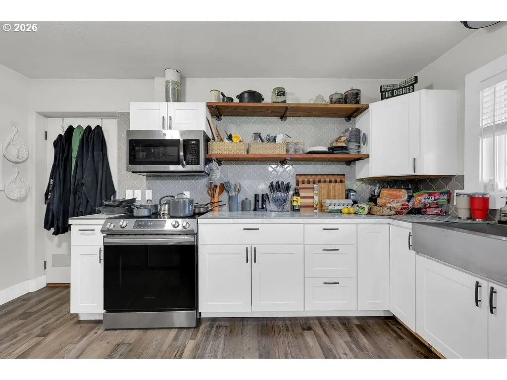 Discover this rare opportunity at 1215 Irving Rd in Eugene’s desirable Santa Clara neighborhood. This charming, fully updated 1-bedroom, 1-bath home offers 1,080 square feet of comfortable, move-in-ready living space on an expansive .54-acre lot. Thoughtfully refreshed with modern finishes throughout, the home features an attached 2-car garage and includes the laundry appliances inside, making everyday living effortless and convenient.The generously sized lot presents exceptional development potential. With ample space and favorable positioning, the property is well-suited for adding ADUs, creating duplexes, or exploring lot division options to maximize value in this high-demand area. Eugene’s supportive zoning for accessory dwelling units and middle housing makes this an outstanding canvas for creative expansion or investment growth.Conveniently located just off Highway 99, the home provides quick access to the Eugene Airport, nearby shopping centers, grocery stores, and all the amenities Santa Clara has to offer. Whether you’re seeking a turnkey single-family residence or a prime development site with strong upside potential, this updated gem on a spacious lot delivers versatility, convenience, and location in one exceptional package. Don’t miss your chance to own a slice of Santa Clara with room to grow.