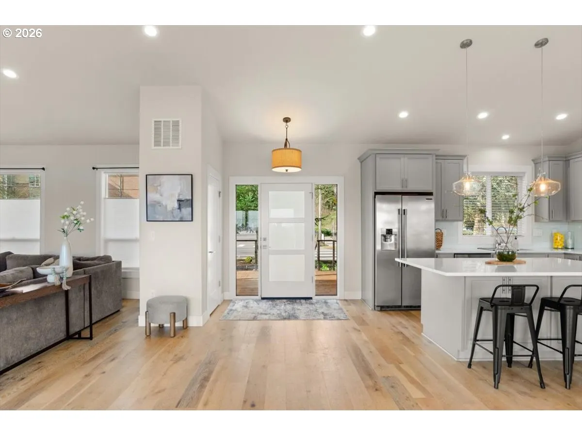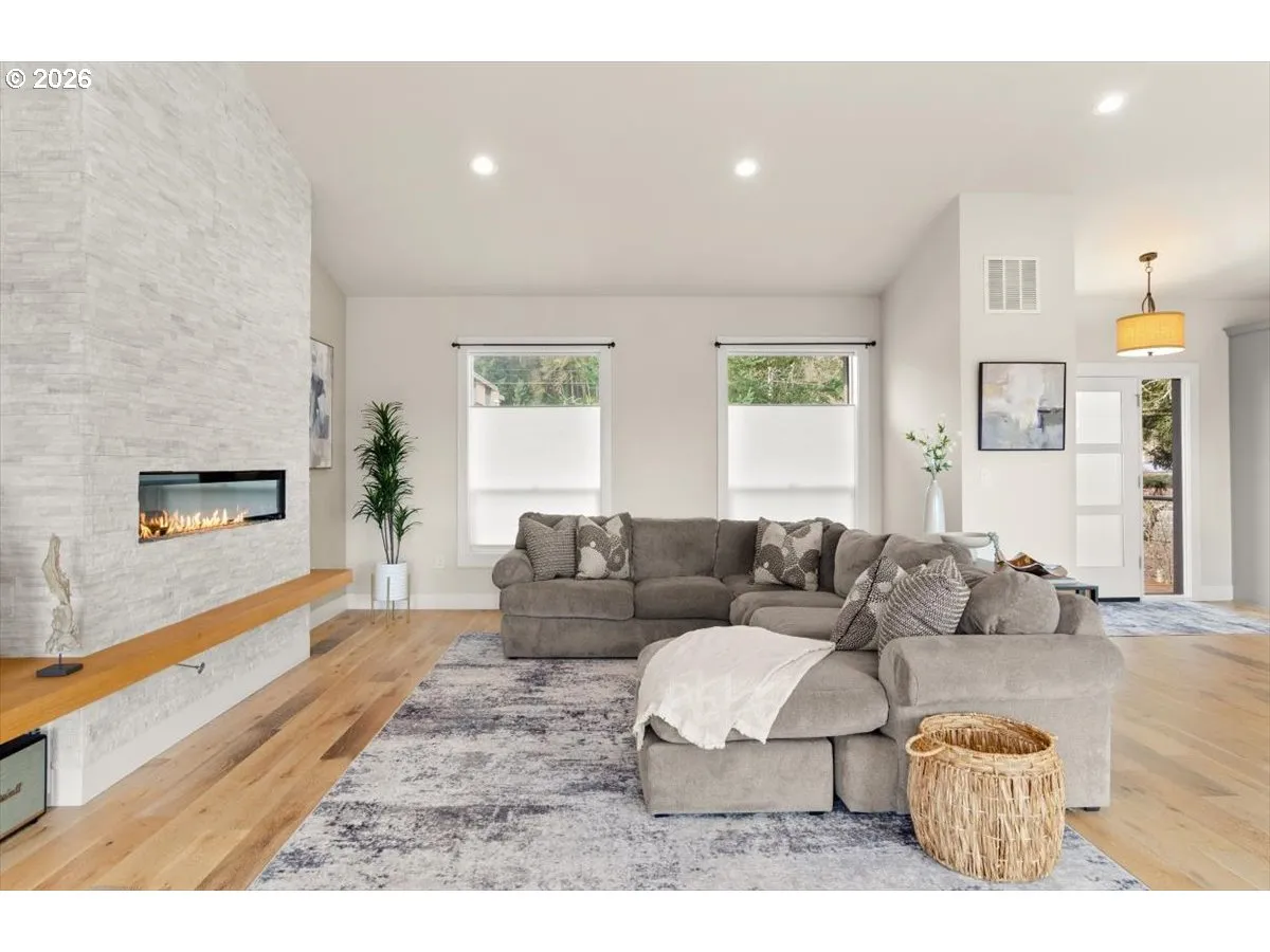 Modernized Northwest Contemporary offering turnkey living and flexible space in a convenient West Linn location. Extensively renovated down to the studs in 2017 and thoughtfully improved since, the home blends contemporary updates with comfortable, functional design.The light-filled main level features open living and dining areas anchored by a striking gas fireplace with limestone surround and color-changing ambiance. The refreshed kitchen is designed for gathering, with quartz countertops, a large island, and newer appliances including a five-burner gas range, drawer microwave, and dishwasher. A 40-foot deck spanning the length of the home extends the living space outdoors and creates an inviting setting for entertaining or relaxing. One level down, the primary suite provides a comfortable retreat with ensuite bath, along with two additional bedrooms, a full bathroom, and convenient laundry. The lower level offers a spacious media or flex living area, an additional bedroom, and full bath—ideal for guests, work-from-home needs, or multi-generational living. Recent upgrades include an energy-efficient Mitsubishi hyper-heating heat pump providing both heating and cooling. Set on a generous .24-acre lot with established trees and a dedicated dog run, the property offers both indoor comfort and outdoor space. Ideally located across from West Linn High School and just minutes to parks, schools, and shopping and dining in both West Linn and Oregon City.