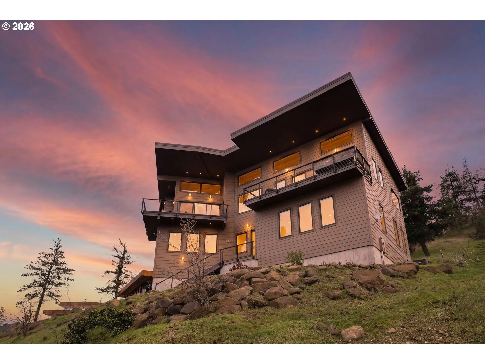 Perched above the Columbia River, this extraordinary Mosier Bluffs residence, built in 2017, offers 180° of world-class views, spanning the iconic Coyote Wall, Syncline, and Mosier Plateau. From the luxury bath, gaze upon the striking Button Bridge as the natural beauty of the Gorge unfolds before you—sunrise to sunset. Set on a coveted 0.39 acre lot, this 4,000-square-foot home exudes refined elegance and thoughtful design. The interior combines dramatic architectural lines with warm, inviting elements highlighted by tongue-and-groove ceilings, creating light-filled spaces that feel both grand and welcoming. The home features 4 bedrooms and 5 bathrooms, including 2 private primary ensuites, offering comfort and privacy for family and guests. At the heart of the home, a gourmet granite kitchen flows seamlessly into expansive living areas, perfect for entertaining or savoring quiet moments with unparalleled views. Modern luxury meets sustainability with 50 integrated solar panels, two Franklin battery backups, a SMART SPAN electrical panel, a Tesla EV charger, and a custom oversized two-car garage that provides ample workspace and gear storage. Every detail has been designed to combine style, function, and energy efficiency.Whether enjoying morning coffee or evening sunsets, the scenery is simply breathtaking. Just minutes from downtown Mosier, the home offers effortless access to riverfront recreation, scenic trails, award-winning wineries, delightful dining, and a charming local coffee shop. Opportunities to own a home of this caliber in Mosier Bluffs are exceptionally rare—an extraordinary lifestyle awaits.