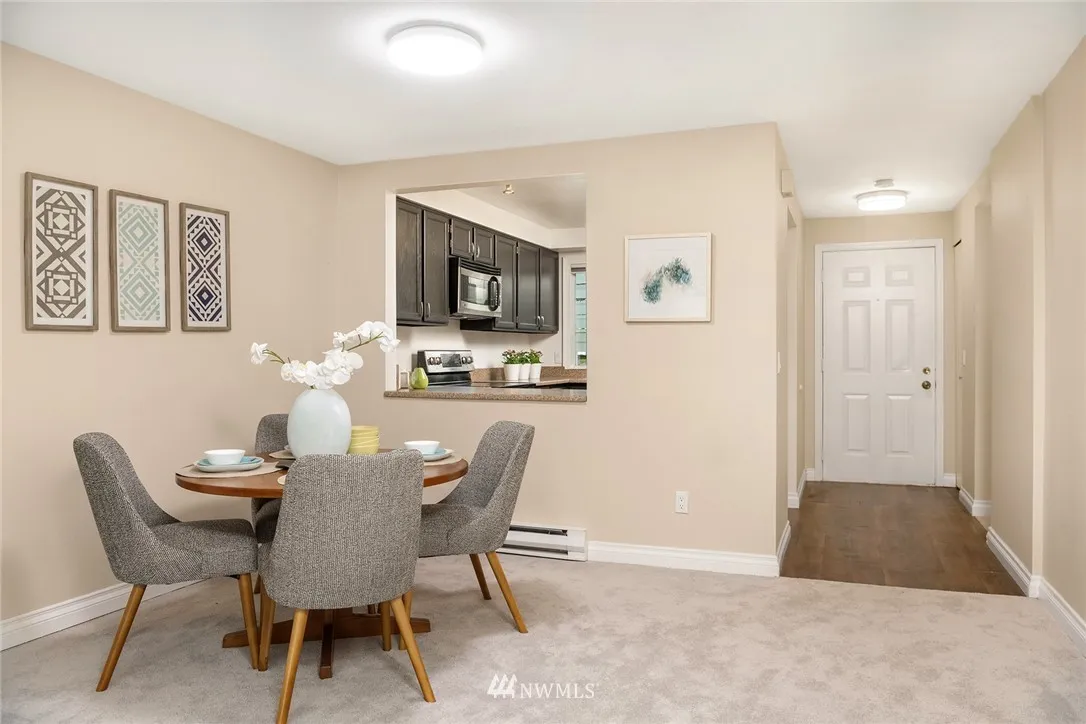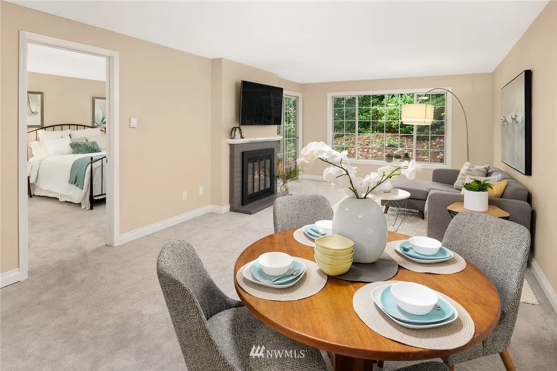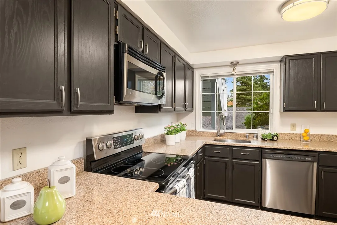 +"PublicRemarks": "Beautifully remodeled private and quiet condo located in a complex that backs to natural greenery for year-round views. Newer paint, carpet, appliances,updated bathroom.Airy kitchen w/granite slab & stainless steel appliances, newer floor. Spacious living rm w/wall of windows. Generous master w/private vanity & sink & sep access to bath AND back deck. Individual garage w/opener & two more parking pass. Walk to Newport High School, Factoria Mall. Minutes from I90, 405."