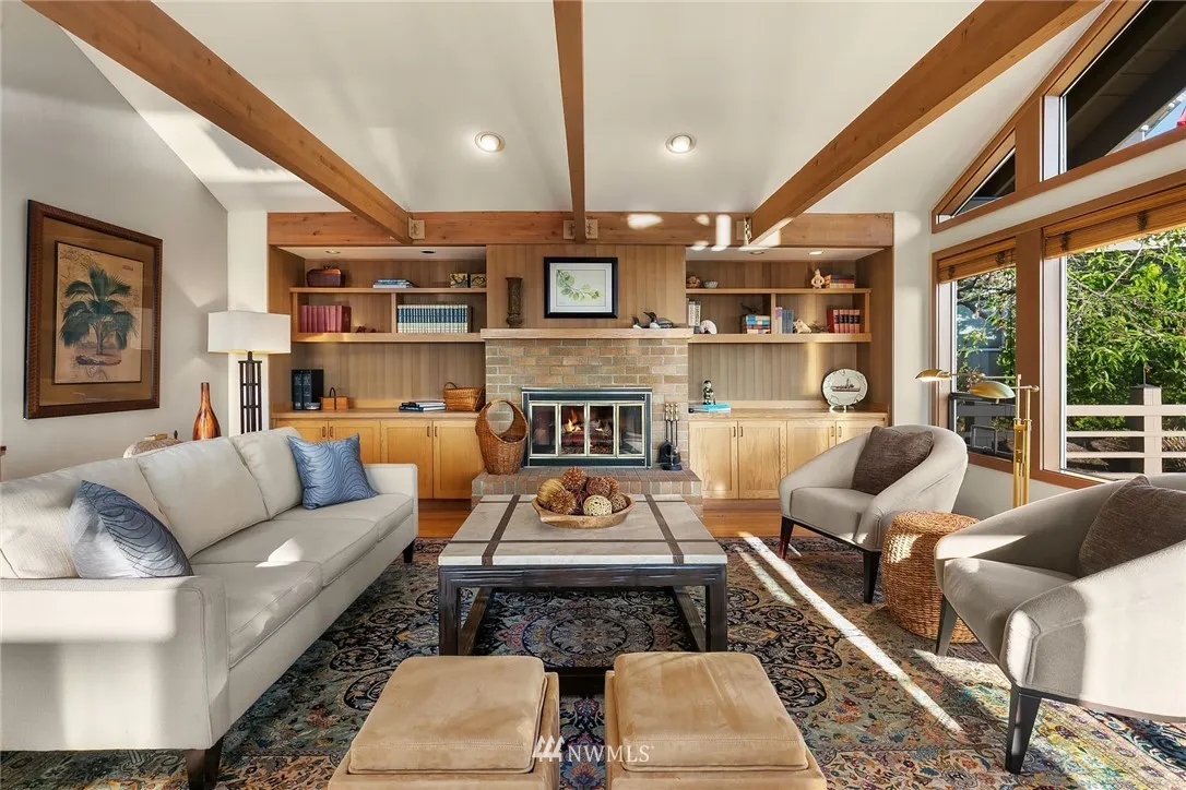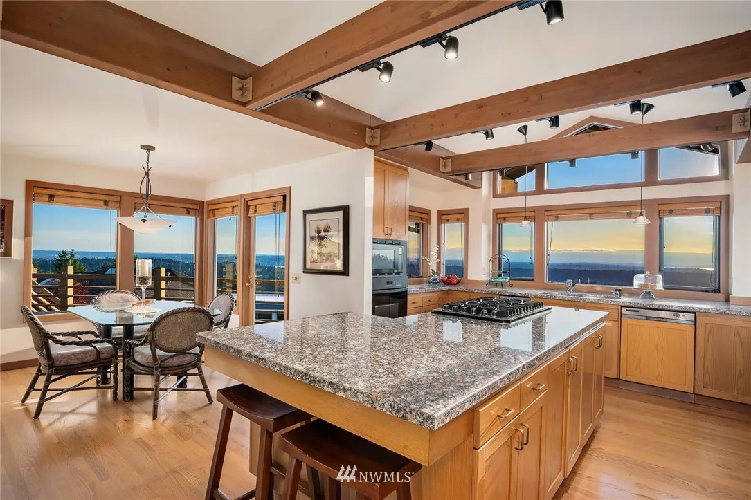 This home offers beautiful contemporary style & an ideal floor plan w/ grand entertaining spaces including a living room w/ soaring ceilings & huge windows & an elegant dining room. Enjoy a lovely kitchen w/ adjoining nook & family room, main floor den w/ fireplace & bar, lower-level rec room & spacious guest beds & baths. Awesome views from the in-ground pool, hot tub & expansive deck & patio spaces!