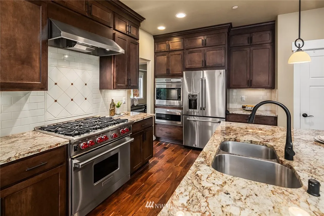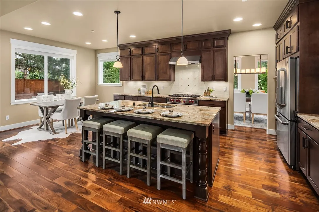 +"PublicRemarks": "Discover a warm, inviting, luxurious 3,810 square ft, 5-bedroom, 3-bath Lakemont Heights home. Rich hardwood floors invite you into an open layout. Chef’s kitchen offers high end Wolf SS appliances and expansive space for culinary exploration. Featuring 2 fireplaces, a main level bedroom with en suite bath, and a master bedroom with a 5-piece and dual shower. Outdoor patio w/fireplace and flat yard perfect for entertaining. Unrivaled Issaquah School District. Distinguished neighborhood."