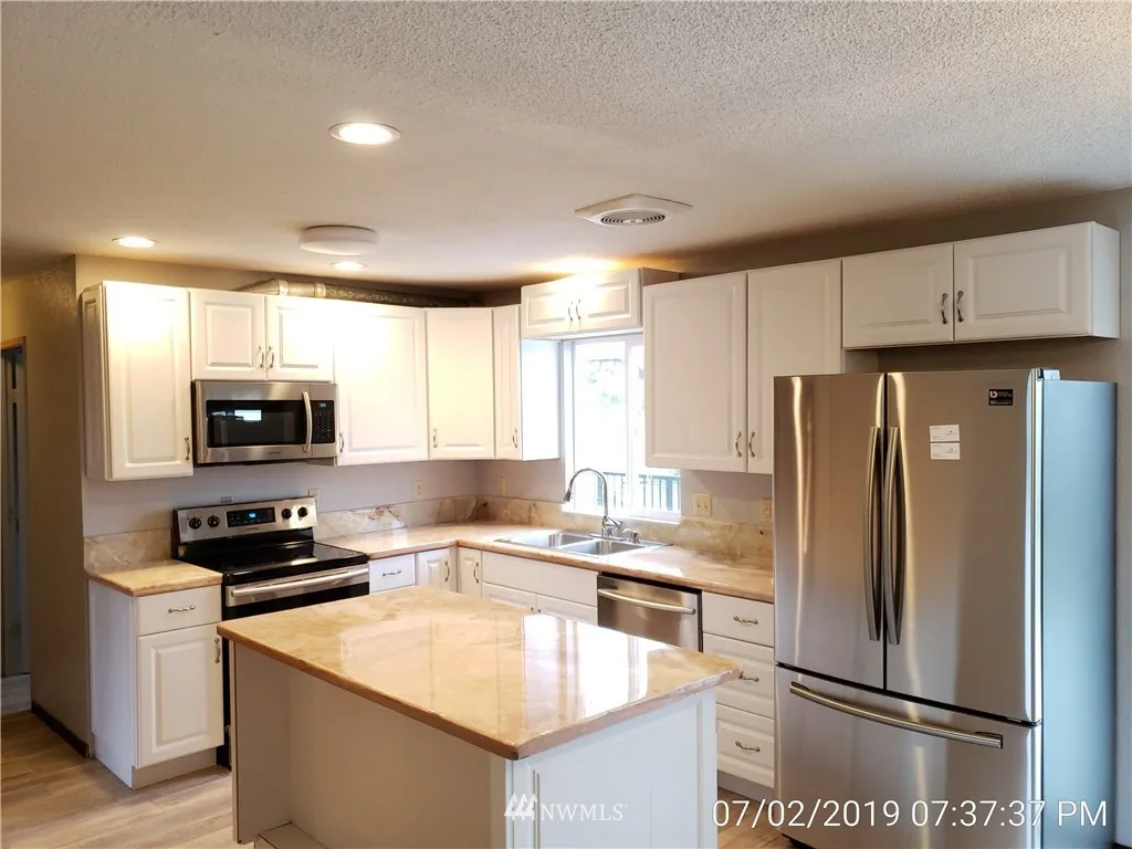 +"PublicRemarks": "Rare 5 bedrooms with new carpet, 3.5 bath. 2 master suites with private bathrooms, with oversize jetted tub. Spacious kitchen with all new cabinets and appliances, dining area and kitchen with new vinyl flooring, formal dining room and living room with fireplace and new hard wood flooring. Large lot, fenced back yard with new deck. All interior newly painted. Popular area, safe, quiet neighborhood, city park and playground across the street. Minutes to schools, shopping & Canadian border."