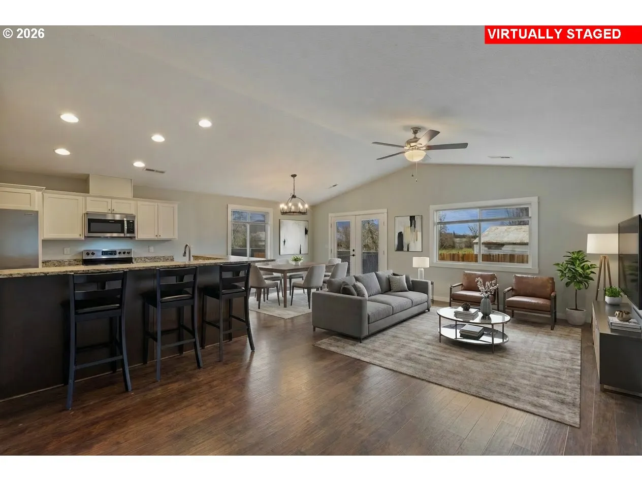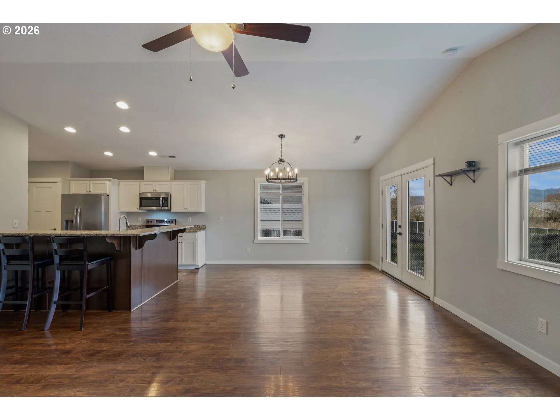 Welcome to this impeccably maintained 2016-built Craftsman Ranch home, where timeless architectural details meet the ease of modern, single-level living. The striking curb appeal makes a lasting impression, featuring contemporary board and batten siding, elegant gables, and a crisp, high-contrast color palette. This is a home designed for those who appreciate both style and substance, offering a spacious open floor plan that maximizes every square foot and creates a seamless flow for everyday living. As you step inside, the entryway leads you into an inviting living room that serves as the heart of the home. Soaring vaulted ceilings and a stylish ceiling fan create an airy feel, while durable luxury vinyl plank (LVP) flooring flows throughout the entire open space. The gourmet kitchen is a true centerpiece, showcasing stunning textured granite countertops that offer ample workspace. Complete with a large pantry and stainless steel appliances, this kitchen is as functional as it is fashionable, making it the ideal spot for morning coffee or hosting holiday gatherings. The primary suite is a true retreat, featuring a generous walk-in closet and a contemporary walk-in shower. Two additional spacious bedrooms provide plenty of versatility, whether you need room for family, a dedicated guest wing, or a bright home office. Practicality is woven throughout the design, including a convenient laundry room situated just off the oversized two-car garage to keep daily chores organized and out of sight. The living experience extends outdoors through elegant french doors that lead to a patio and a fully fenced backyard. This outdoor space is your personal canvas—perfect for summer barbecues, gardening, or simply relaxing in the fresh Oregon air. Enjoy quick I-5 access for a hassle-free commute and easy weekend trips to the Umpqua Valley’s famous wineries, trails, and rivers. Combining modern luxury with an unbeatable location, this home is a must-see—schedule your tour today!
