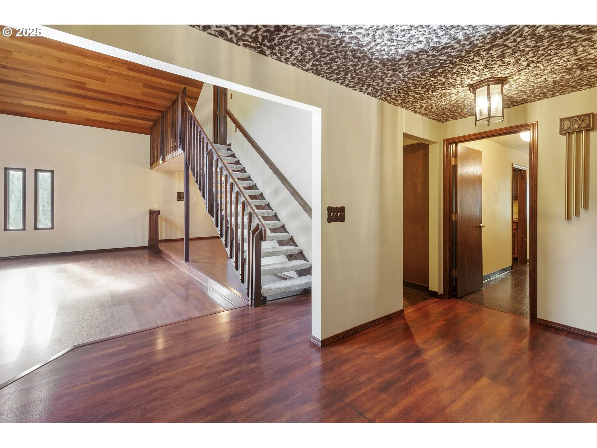 CUSTOM HOME ON PRIVATE ACREAGE. 3 bedrooms, 2 1/2 bathrooms, 2602 sqft on 8.8 acreage. Two story vaulted living room w/ brick fireplace and balcony. Formal dining room w/ laminate floors. Large kitchen w/ eating area. Bonus room on the main w/ slider to the back deck and yard. Bedrooms 2 & 3 both on main w/ access to updated bathroom. Primary bedroom upstairs is vaulted w/ walk-in closet & full bathroom. New roof and gutters in 2009. Cedar siding. Newer windows. Furnace& AC. Central vac system and a water filtration system too. Inside of the home needs cosmetic updating but is structurally sound. Property has mature timber, a storage barn w/ run-in shed & chicken coop. Private & fairly secluded location in the Hockinson school district.