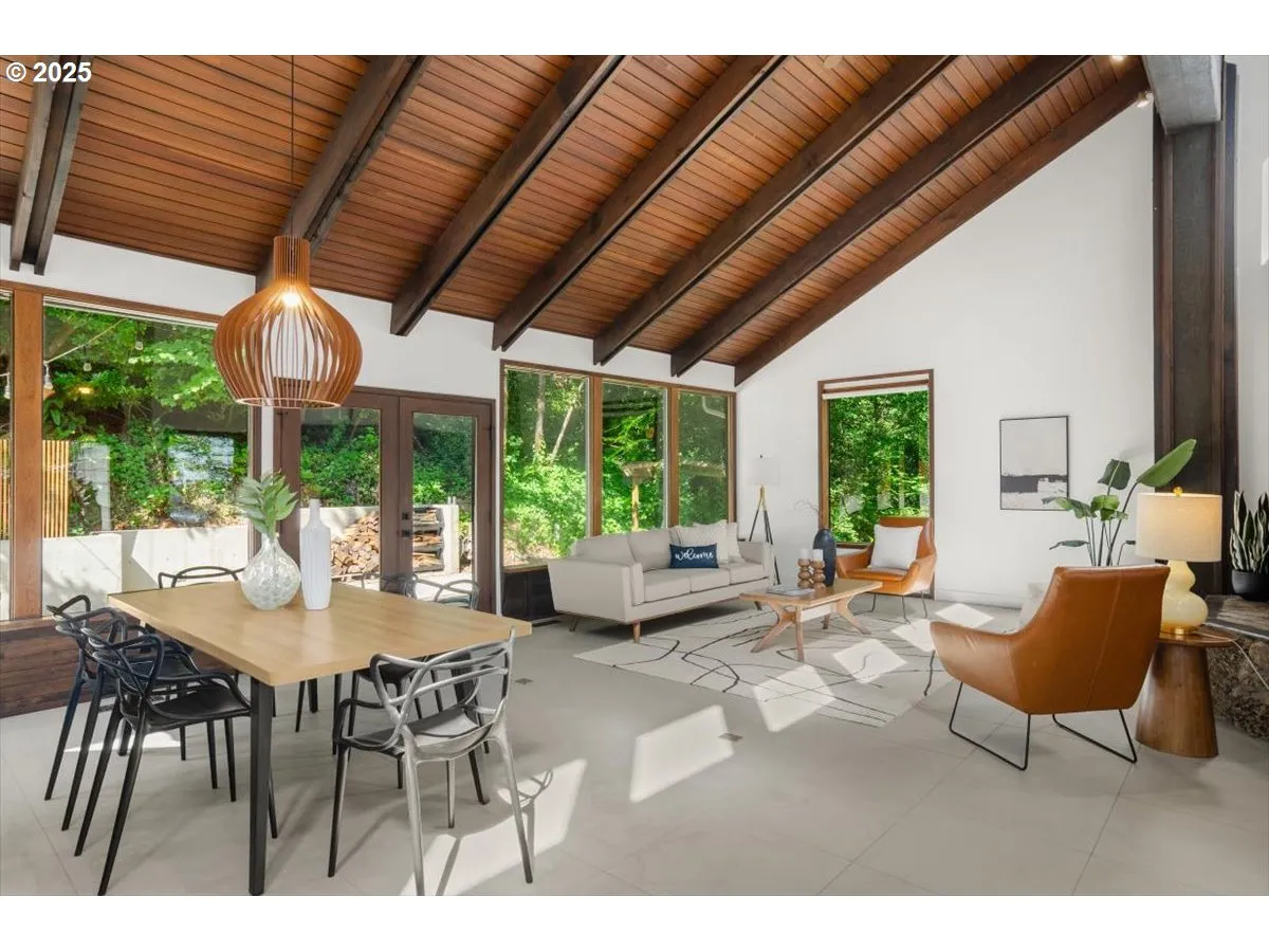 Mid-Century Modern design meets Northwest serenity in this beautifully updated home where clean lines, functional elegance, and seamless indoor-outdoor living unfold against breathtaking views of the Willamette River, Mt. Adams, Mt. St. Helens (if you’re lucky!), sunrises, and the lush natural landscape. Tucked away on a rare and peaceful .6-acre lot spanning three tax parcels near Forest Park, this private retreat offers space, privacy, and a strong connection to nature. Vaulted wood ceilings, a dramatic 50-foot exposed beam, stone fireplaces, designer lighting, floating shelves and vanities, barn doors, subway tile, a spiral staircase, and warm wood accents infuse architectural charm into the open-concept layout. Expansive windows and glass doors bathe the interior in natural light and lead to multiple decks, a patio with firepit, and a private hot tub deck—ideal for entertaining or unwinding while soaking in the view. Floating concrete steps and heated tile floors add thoughtful, modern comfort. The chefs kitchen features quartz counters, new appliances, pantry, farm sink, dining nook, and large island with bar seating, all open to the living and dining areas for effortless entertaining. The luxurious primary suite offers a huge 15′ x 12′ walk-in closet with built-ins, a walk-in shower, dual sinks, and in-room laundry. The lower level features a separate entrance, kitchenette, washer/dryer, bonus room, bedroom, and bathroom, perfect for guests, multigenerational living, or rental income. A workshop, loft, office, and family room provide space to create, play, or relax. With easy access to Forest Park trails, cycling, kayaking, U-pick farms, St. Johns, Sauvie Island and just 10 minutes from downtown, this is an extraordinary lifestyle opportunity! Excellent schools, Skyline and Lincoln! Schedule your tour today and make this exceptional home yours! [Home Energy Score = 1. HES Report at https://rpt.greenbuildingregistry.com/hes/OR10227440]