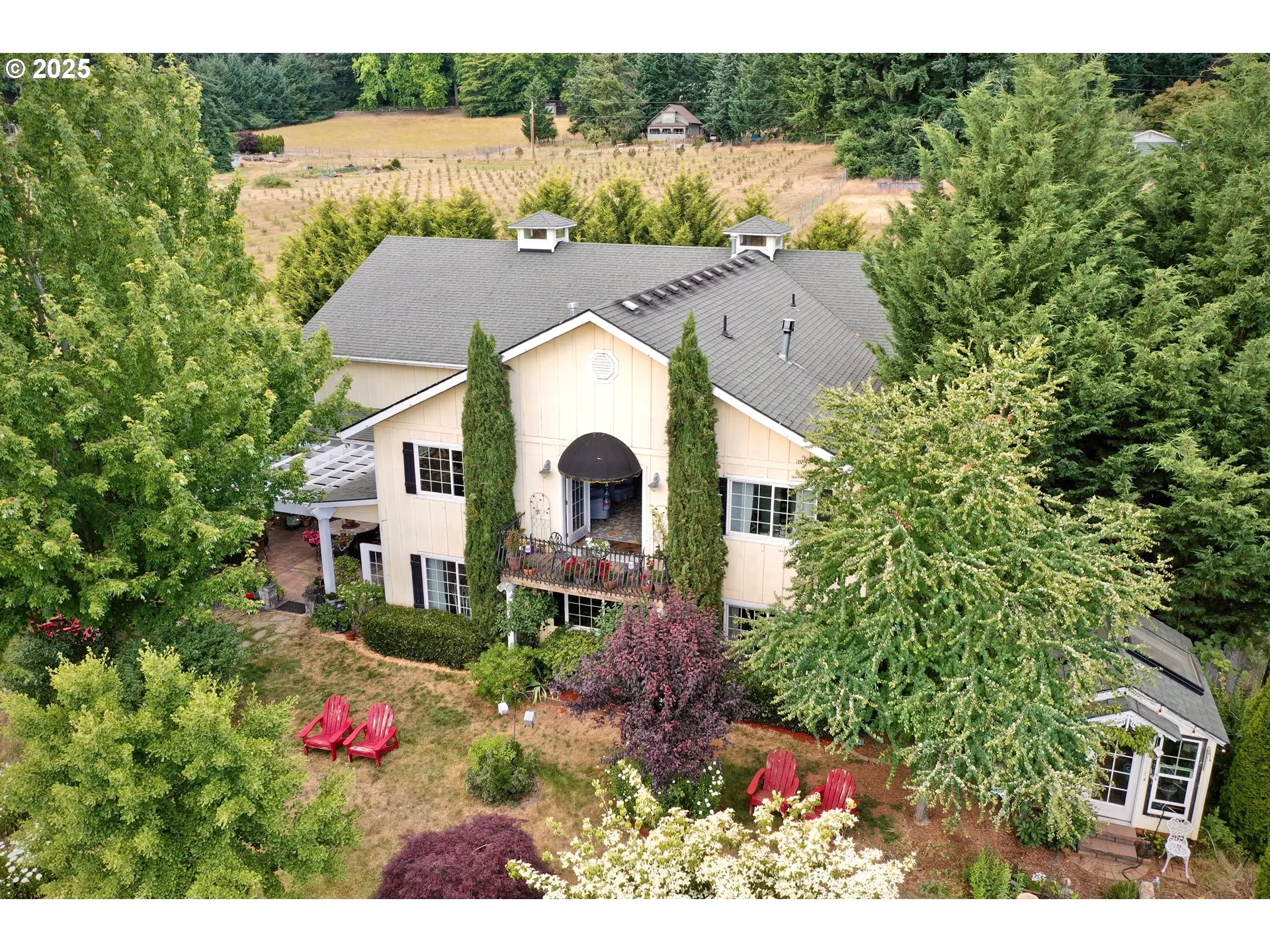 Discover the charm and potential of this 6.81-acre property, once home to Tebri Vineyards and Lavender. Nestled in a picturesque setting, this home offers a blend of natural beauty, architectural character, and agricultural opportunity. At the heart of the property is the former tasting room—an inviting space now perfect as a grand gathering area for family and friends. With its warm ambiance and open layout, it’s ideal for hosting celebrations or enjoying peaceful country evenings.The custom-built home features vaulted ceilings, a stunning kitchen designed for entertaining, and a unique loft-style primary suite that adds both privacy and personality. An unfinished second loft offers even more potential—whether for additional living space, an art studio, or a cozy retreat. Outside, the grounds are dotted with mature landscaping, creating a tranquil, park-like environment. The 1-acre block of established Pinot Noir vines are planted on 3309C rootstock with a field blend of 115, Wadenswil and Pommard and adds a touch of vineyard lifestyle with an opportunity for hobby winemaking or boutique production. Additional outdoor features include an adorable greenhouse for year-round gardening, a large gazebo, and a covered patio ideal for alfresco dining or relaxing with a glass of wine. Whether you’re looking to revive a winery, create a family estate, or simply enjoy a peaceful rural lifestyle, this one-of-a-kind property offers a rich canvas to make your vision a reality.