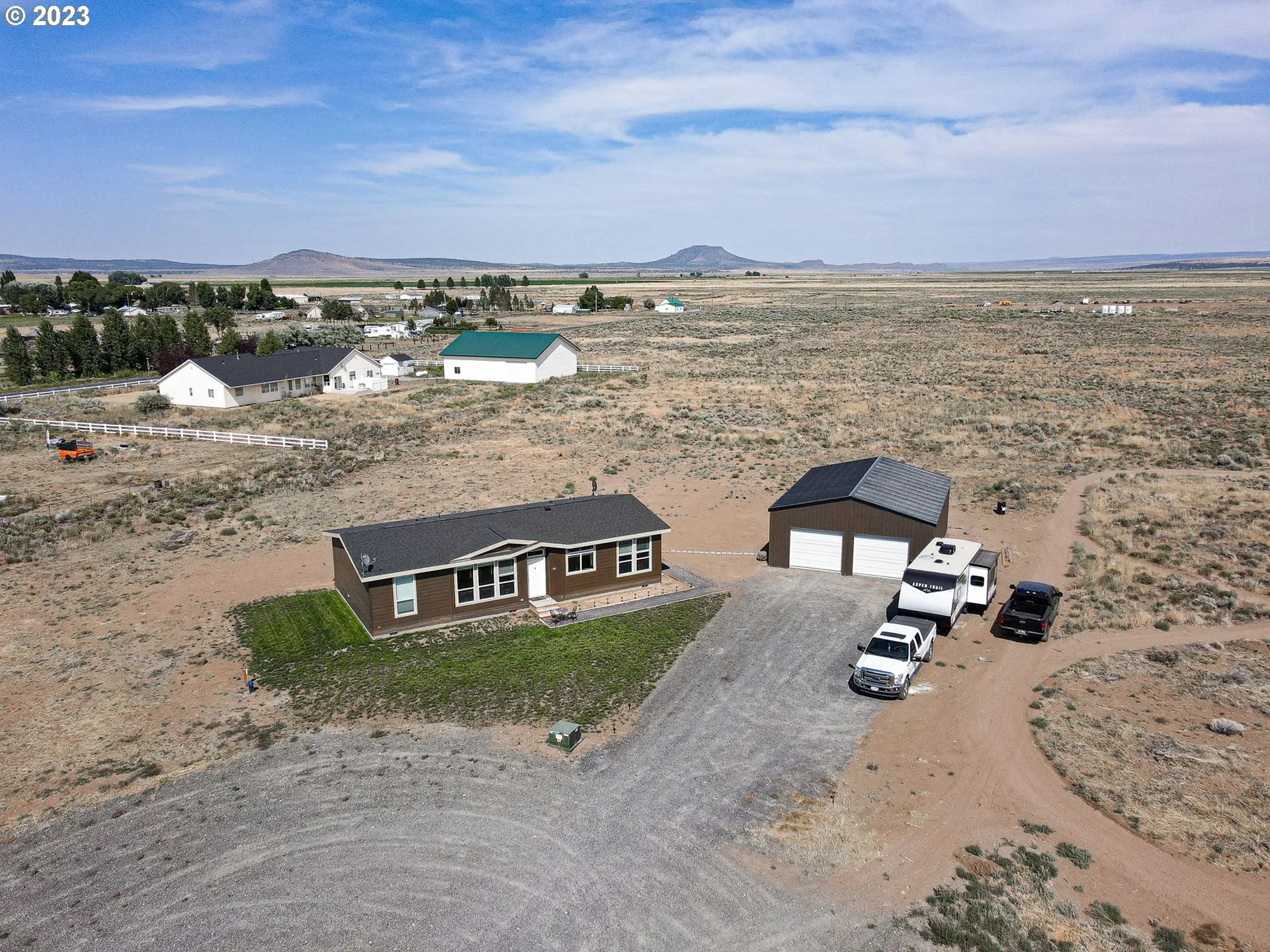 Cute and like new home in the beautiful town of Silver Lake on 2 tax lots. The house is a 3 bedroom, 2 Bath manufactured home was built in 2022. The 30′ X 40′ shop with concrete floors and power and was built in 2023. Shop doors are 10′ wide and 8′ high. Both the house and shop are super clean and have spectacular views of the surrounding ranch country and hills. The well and septic are new. Master bedroom has a walk-in closet, an oversized bathtub, and a walk-in shower. Home has an efficient heat pump and A/C. Upgrades to the home include: 9ft ceilings, tall kitchen cabinets, 3 layer tall block and mortar foundation, and the extra insulation package. With over 2 acres of land there is plenty of room for animals and garden plants. House has 400amp service and shop has 100amp service. Property tax information does not include current assessment of home and shop. The improvements have not assessed yet.
