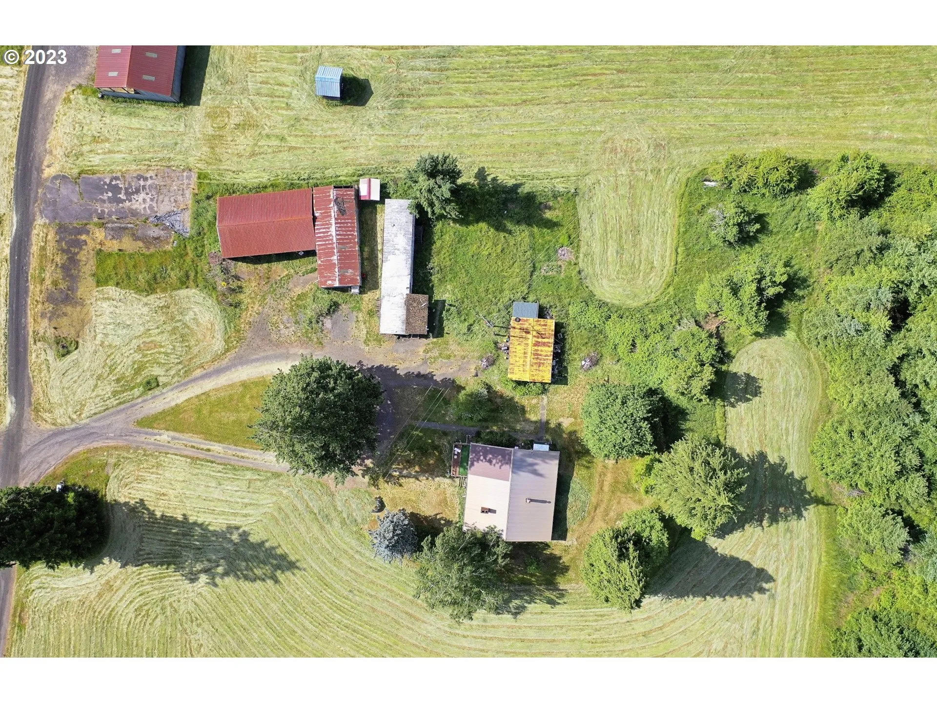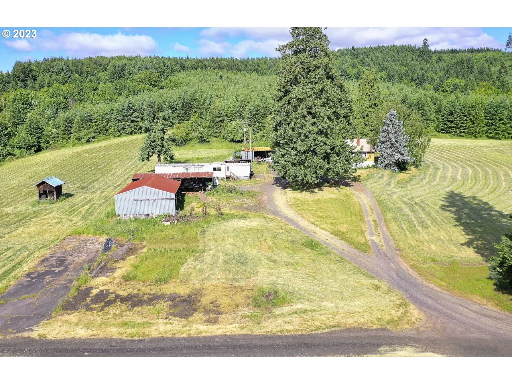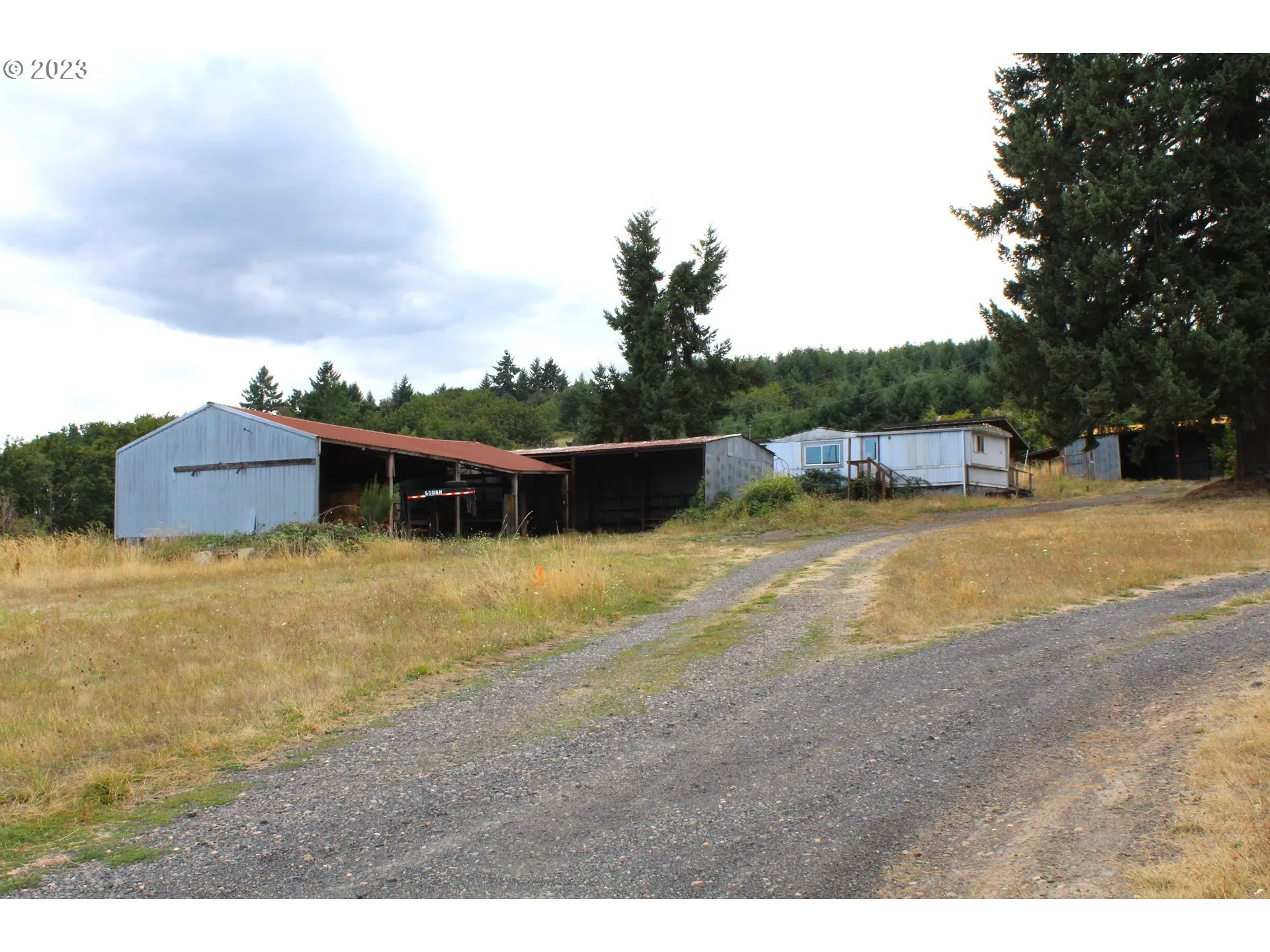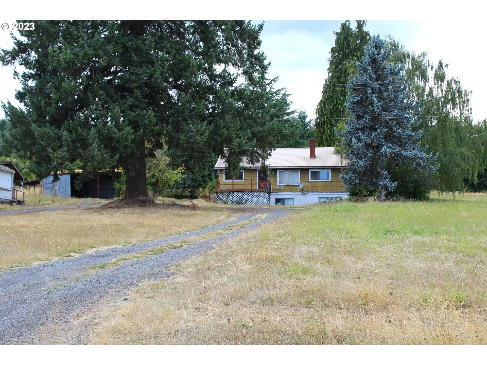Mt. Hood & Territorial View! This 1949 fixer offers loads of potential. 4 bedrooms and 1 bath on the main level, partially finished basement with family room and a 2nd bathroom, multiple fireplaces, and more. Located on 3.85+/- acres with fruit trees, 2 septic systems, shared well, multiple outbuildings (carport, RV Storage, and workshop), plus beautiful territorial and mountain views. Single wide on property of no value. Grandfathered in for two dwellings. Buyer to do own due diligence.