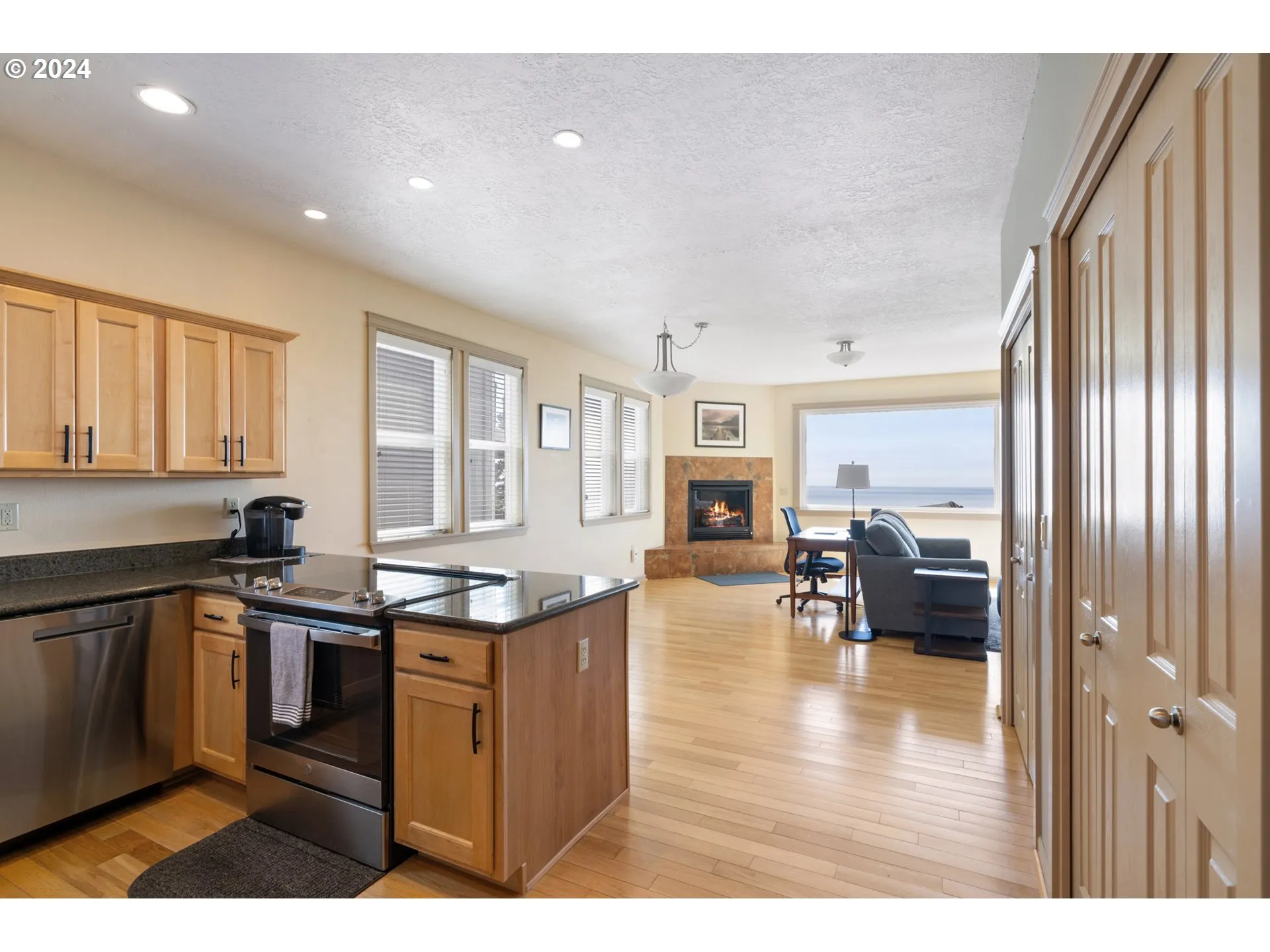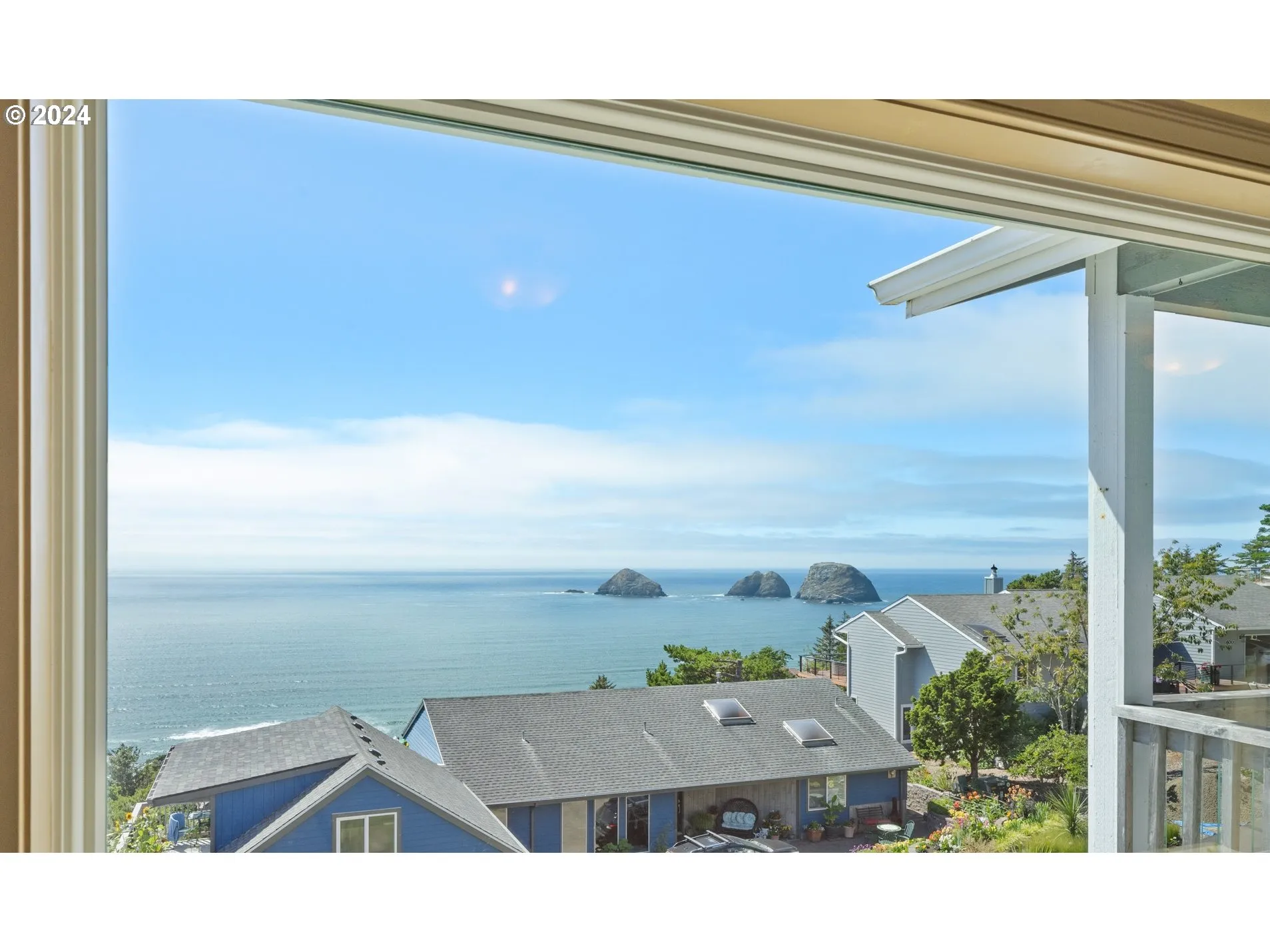 DAZZLING OCEANVIEW includes Three Arch Rocks. Great home design with 3 ensuite bdrms: 1 on ground floor has separate entrance and could become an ADU. Short Term Rental allowed with license. Open concept granite kitchen/dining/living with large corner fireplace. Custom wood cabinets & rich wood flooring. Grand primary bdrm big enough to live in full time! Sitting area, romantic fireplace, fabulous view, lavish bathroom with large tub & tiled shower. Storage galore. Excellent house for art collector: lots of wallspace. Office nook on main floor.