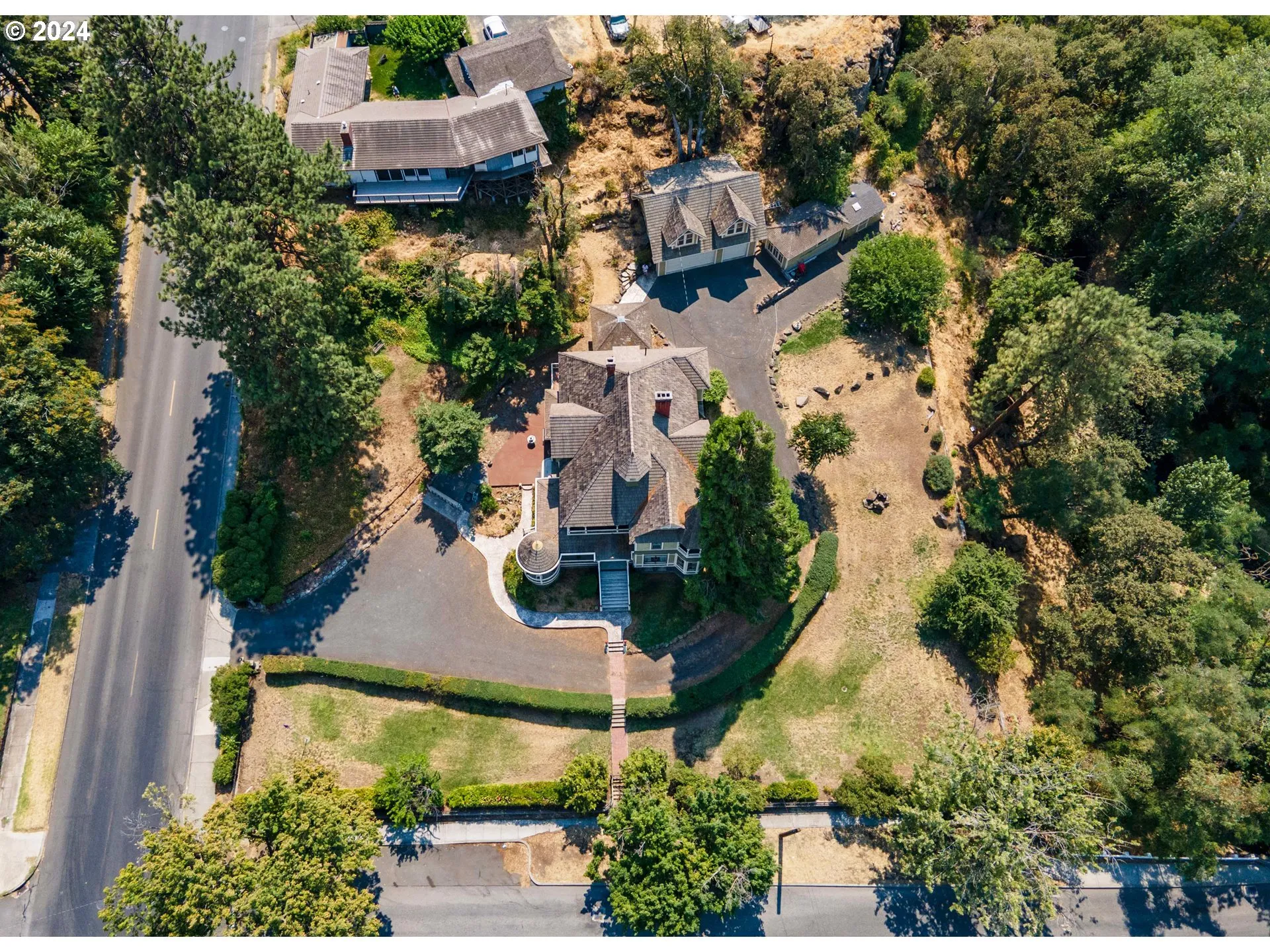Welcome to The Crown Jewel Estate of The Dalles! This historic Queen Anne Victorian is truly a masterpiece, situated in a serene park setting on Mill Creek, just a short stroll from downtown. This is an opportunity to own a piece of history, complete with all the original features including 11 ft ceilings, a grand staircase, “servants” stairs, wraparound porch, cupola, hardwood floors, marble fireplaces, balconies, cedar shake roofing, working pocket doors, and so much more. The estate has been updated with central heating and air conditioning, ensuring that you and your guests will always be comfortable. If you are looking for storage or workshops, the basement has plenty of space for both. The wide-open finished 4th floor ballroom is a perfect space for entertaining. Outside, you’ll find a circular drive, a patio with a gazebo, and an underground sprinkler system. On top of the 3 car carriage house there is a semi-finished loft unit with separate power. Whether a family estate or a furnished B&B, the possibilities truly are endless. Buyer to do due diligence on intended uses. Furnishings are negotiable. Don’t miss out on this incredible opportunity to own a piece of history in The Dalles. See the historic overview presentation link above.