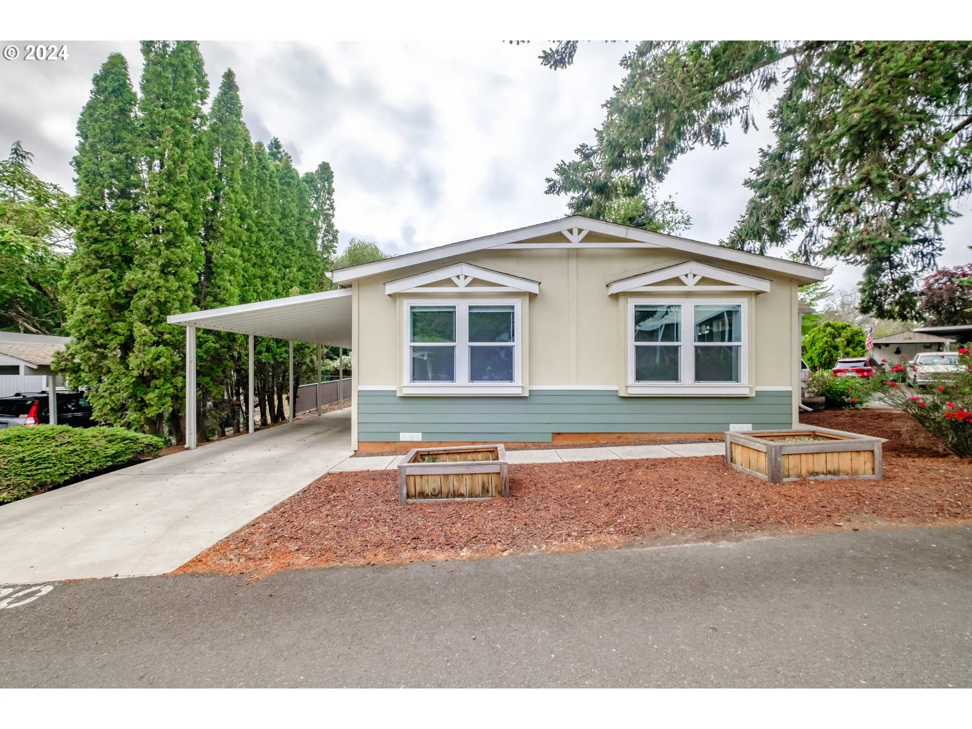 Priced to sell ! Knoll Terrace all age-park. 2019 Palm Harbor, double wide manufactured home. 3 BR, 2 BA, 1512 sqft. High ceiling living room, morden primary bedroom with walk in shower and big closet. All bedrooms have new carpet. Large kithchen with refrigerator, walk in pantry. dining room, spacious laundry room. Covered patio, deck. 3 cars carport with storage shed. Electric furnace, dish washer. Park rent $796 / month including water, sewer, cable, play ground, club house.Bus-lines to the entrance. 4 miles from OSU.Subjects park approval.