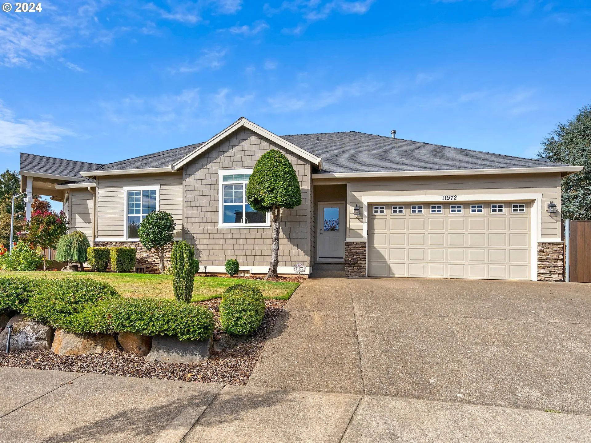 This single-level home, built in 2003, offers an inviting layout with 2,219 sqft of living space and sits on a beautifully landscaped 0.23-acre corner lot. Natural light pours in through the many windows, showcasing the oak floors and fresh paint throughout. The heart of the home is the cozy kitchen featuring a cozy eating bar, which opens to a spacious living area complete with a gas fireplace. The primary suite offers double sinks, and a lovely walk-in closet. The other two bedrooms offer plush carpet along with a recently updated guest bathroom providing extra comfort for visitors. Step outside to enjoy the covered patio, perfect for entertaining, and a meticulously maintained yard featuring a sprinkler system, root watering system, and low-maintenance landscaping. Enjoy blueberries, raspberries, apples and plums all summer long. The fenced backyard includes Trex fencing on both sides of the house, a garden shed, and plenty of privacy. No need to worry about storage as this home features a giant garage with plenty of shelving and a handy work area. With attention to detail in every corner, this home is ideal for all as it is stunning, low-maintenance, and a thoughtfully designed space. Welcome home!
