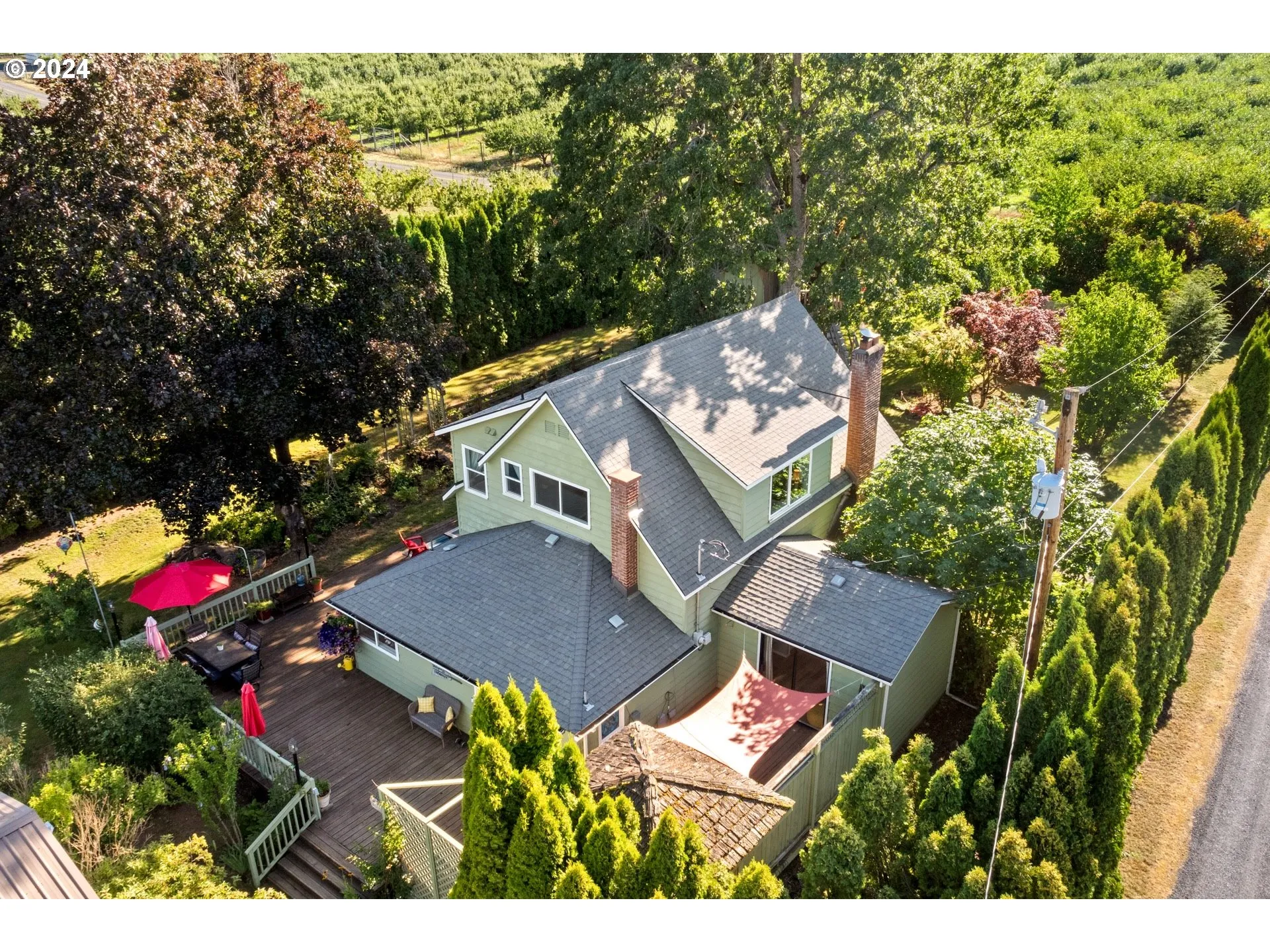 Escape to the picturesque beauty of Hood River, Oregon, with this enchanting 0.69-acre farm property, offering the perfect blend of rural tranquility and up to date comfort. Nestled in a charming small-town, this property invites you to embrace the serenity and simplicity of country living without compromising on amenities. Conveniently close to Kingsley, bike trails, and mountains, it’s an ideal location for nature enthusiasts.The updated farmhouse boasts three inviting bedrooms, including a master suite designed for ultimate relaxation and a spacious walk-in closet. The large living room features a cozy wood fireplace, perfect for unwinding after a day exploring Hood River’s stunning surroundings. A bright dining room with elegant French doors opens to outdoor views, creating an ideal setting for family meals or entertaining guests.Outdoor enthusiasts will love the lush garden beds and fenced yard, effortlessly maintained with the property’s irrigation rights. Whether you’re a gardening aficionado or simply enjoy fresh, home-grown produce, this is your opportunity to cultivate your own piece of paradise. Entertainment and relaxation are at the heart of this property, featuring a whimsical treehouse with electricity, a trampoline for endless fun, and an outdoor covered bar perfect for hosting gatherings. The expansive wrap-around deck offers an idyllic spot to take in the breathtaking views and enjoy the peaceful ambiance. Experience sustainable living with the charming chicken coop, perfect for raising chickens and enjoying fresh eggs. The property also includes a versatile shop with an attached covered area, ideal for storing equipment or indulging your hobbies.Hood River’s stunning landscapes and welcoming community provide a unique backdrop for this exceptional property. Whether you’re seeking a peaceful retreat or a permanent home, this farmhouse offers the best of rural living with all the amenities you need.