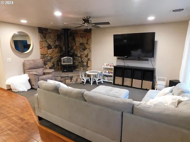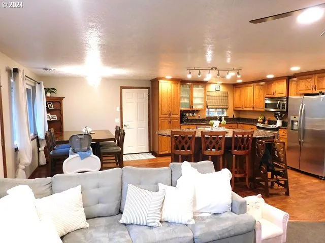 Discover the charm of this beautiful single-level home, boasting 1,066 square feet of thoughtfully designed living space. Built in 1977, this residence features two spacious bedrooms and a well-appointed bathroom.As you enter through the front door, you’re welcomed into an inviting open living area that exudes warmth and elegance. The living room is accentuated by recessed lighting, creating a cozy ambiance, while the double vinyl windows flood the space with natural light, illuminating the entire area. A charming wood stove serves as a focal point, perfect for those cooler evenings when you want to relax and unwind. The heart of this home is undoubtedly the kitchen, where lovely engineered Hickory hardwood floors flow seamlessly into the dining area. Here, you’ll find a large island and breakfast bar that serves as both a functional workspace and a gathering spot for family and friends. The kitchen is equipped with solid oak cabinets featuring convenient pull-out drawers, beautiful granite countertops, and sleek stainless-steel appliances, making it a chef’s delight. Retreat to the primary bedroom, which boasts an expansive walk-in closet that offers ample storage, and is so large that the current owner has an office inside. The room also provides access to a charming covered deck, ideal for enjoying your morning coffee or evening sunsets, and features a cozy hot tub for relaxation and rejuvenation. Further enhancements to this home include a heat pump for central heat and air conditioning, a new electrical panel, and a handy 30-amp generator hookup, ensuring comfort and convenience year-round. This home truly blends functionality with style, making it a perfect place to create lasting memories.