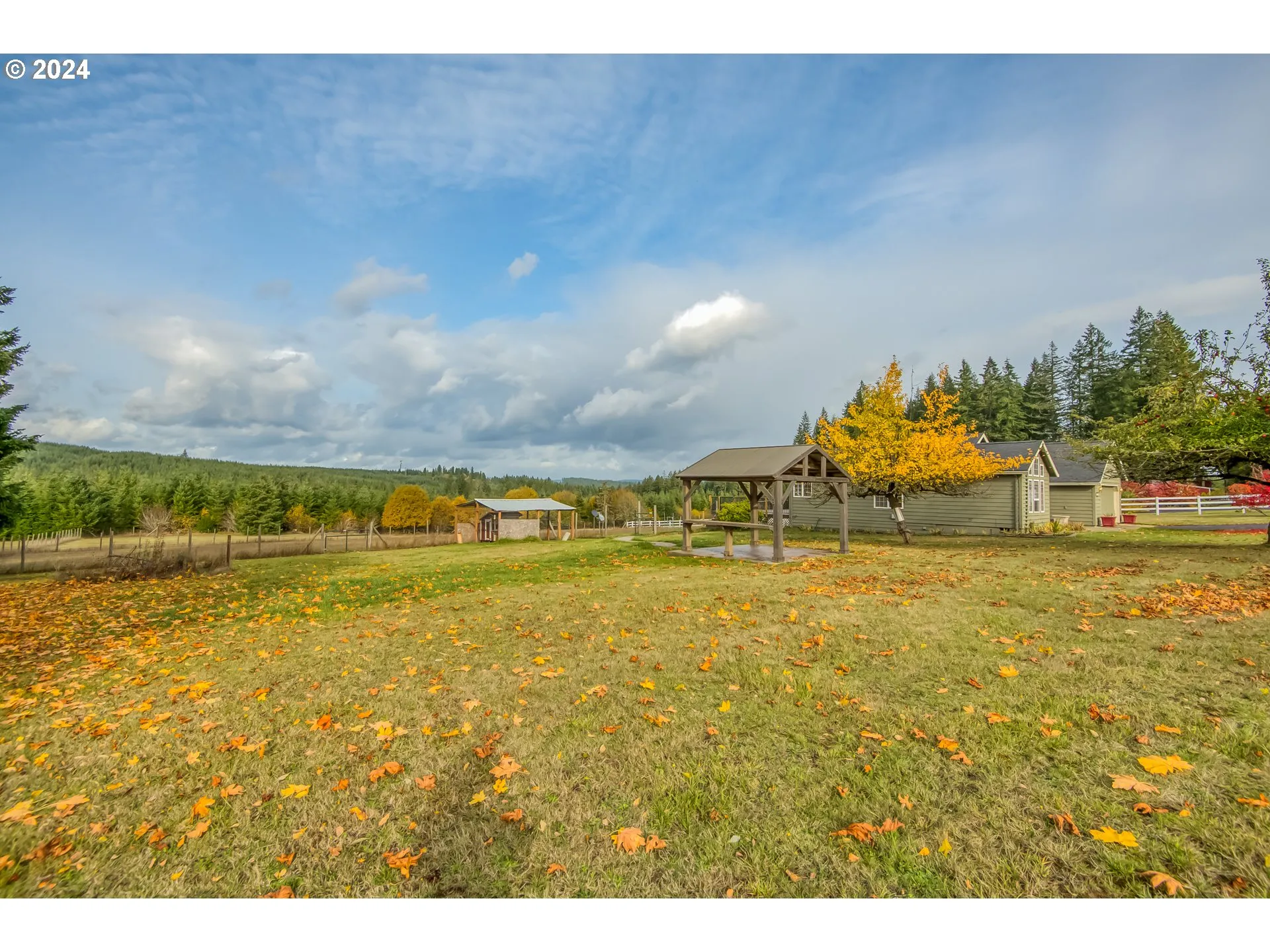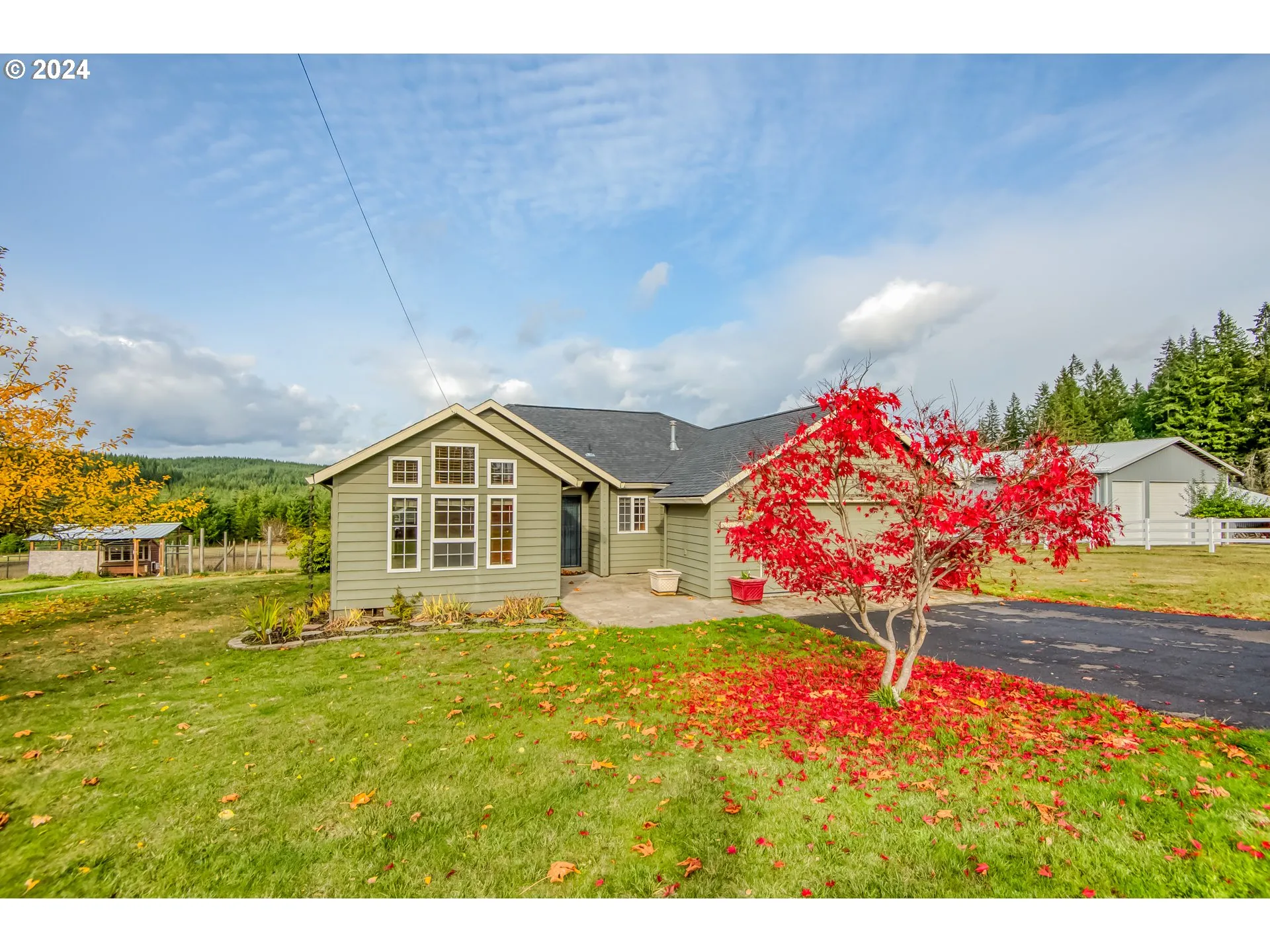 Nestled in a prime Vernonia location on a quiet, paved dead-end road, this property offers remarkable peace and tranquility in a scenic, forested setting on a ridge above town. Step inside to find a move-in-ready, single-level home filled with comfort and style. The hardwood entry leads to a spacious, vaulted living and family room, complete with a cozy natural gas stove for those chilly winter nights.The easy-care island kitchen features granite countertops, a stainless steel gas range and oven, and ample oak cabinetry with a pantry to meet all your storage needs. Enjoy serene forest views from the kitchen and bay-windowed breakfast nook. A generous dining room with double glass doors opens to a large deck, perfect for outdoor entertaining and taking in the views.The primary suite includes French doors leading to the back deck, a double vanity, a walk-in closet, and a skylight that bathes the bathroom in natural light. Additional amenities include a new forced-air heating system, a 10×20 storage shed with a loft, a 10×8 tool shed, an enclosed dog kennel, and a cozy chicken coop. Don’t miss the chance to make this beautiful homestead your own—come take a closer look!